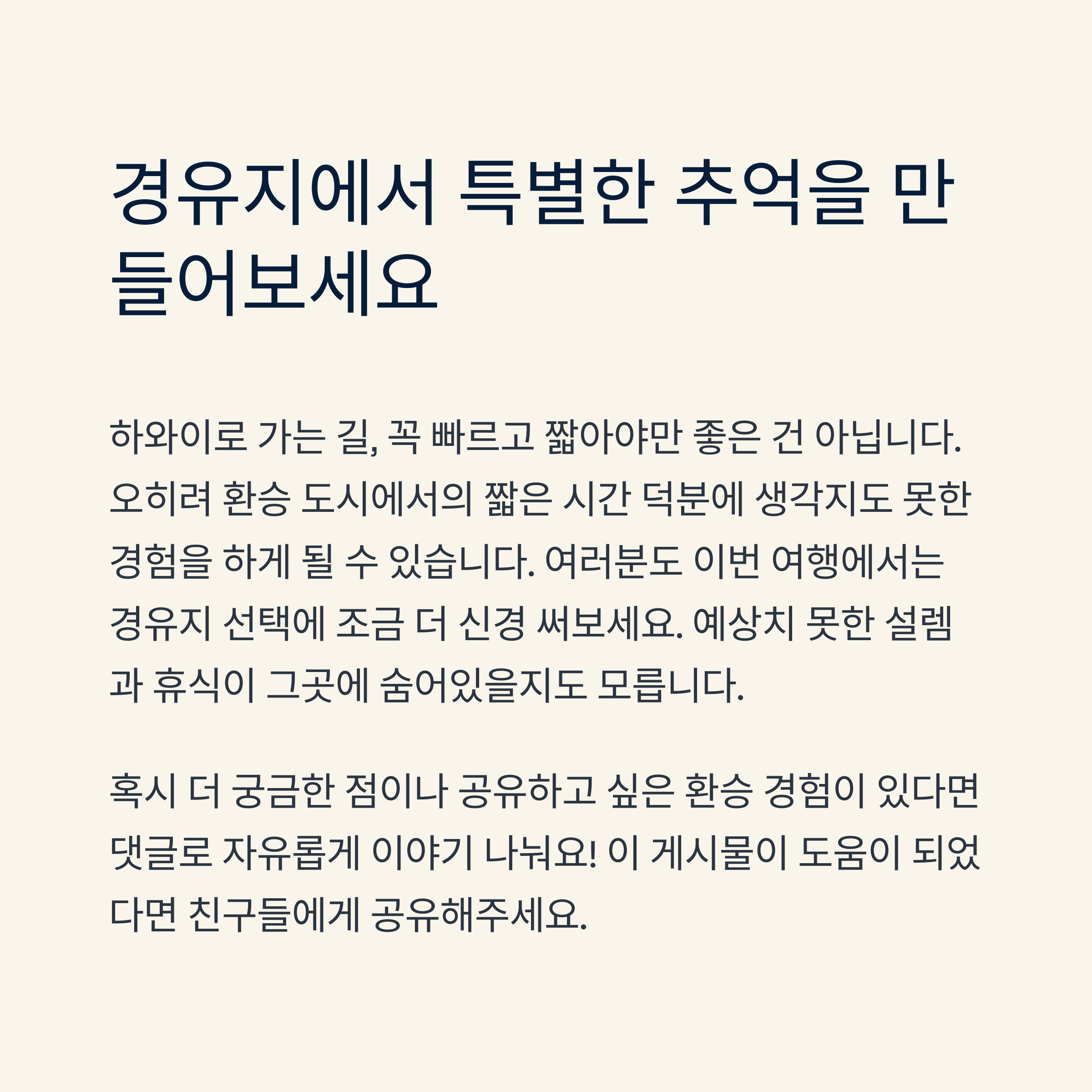 하와이로 가는 길, 꼭 빠르고 짧아야만 좋은 건 아니더라고요. 오히려 환승 도시에서의 짧은 시간 덕분에 생각지도 못한 경험을 하게 된 적도 있었고요. 여러분도 이번 여행에서는 경유지 선택에 조금 더 신경 써보세요. 예상치 못한 설렘과 휴식이 그곳에 숨어있을지도 몰라요. 혹시 더 궁금한 점이나 공유하고 싶은 환승 경험이 있다면 댓글로 자유롭게 이야기 나눠요!