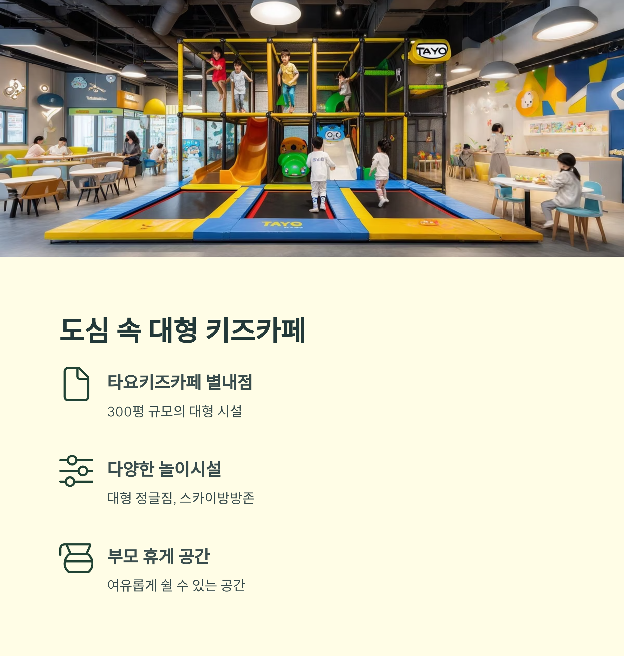 비가 오거나 날씨가 좋지 않은 날에도 아이들과 신나게 놀 수 있는 곳으로 대형 키즈카페가 추천됩니다.