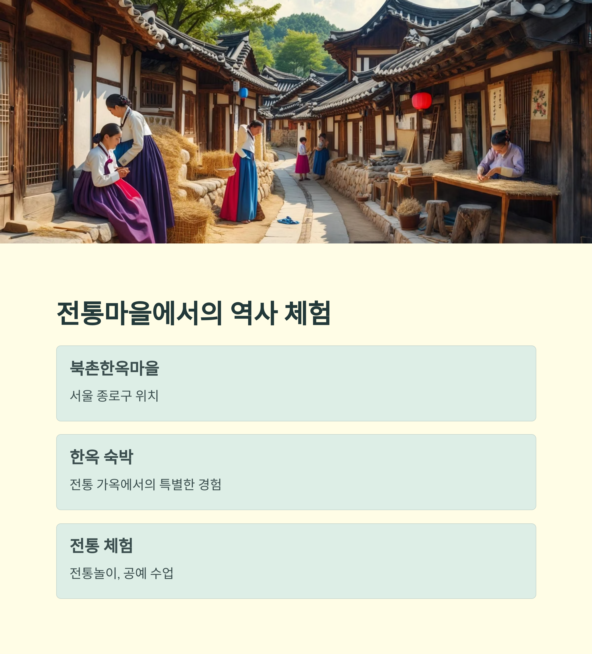 전통마을은 우리 문화와 역사를 가까이에서 배우고 느낄 수 있는 교육적 가치가 높은 여행지입니다.