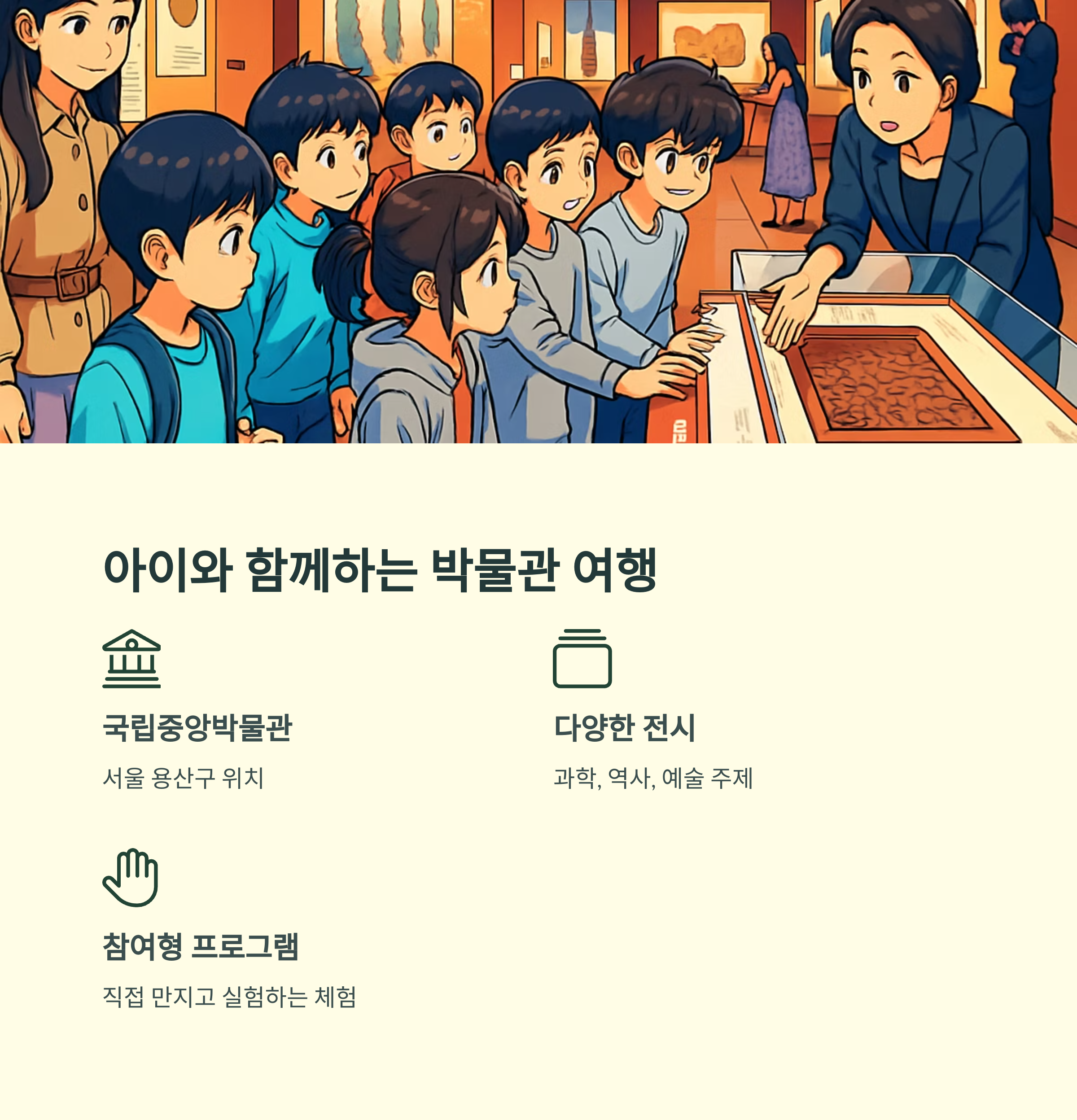 과학, 역사, 예술 등 다양한 주제의 전시와 함께 참여형 프로그램이 운영되어 아이의 호기심을 자극합니다.