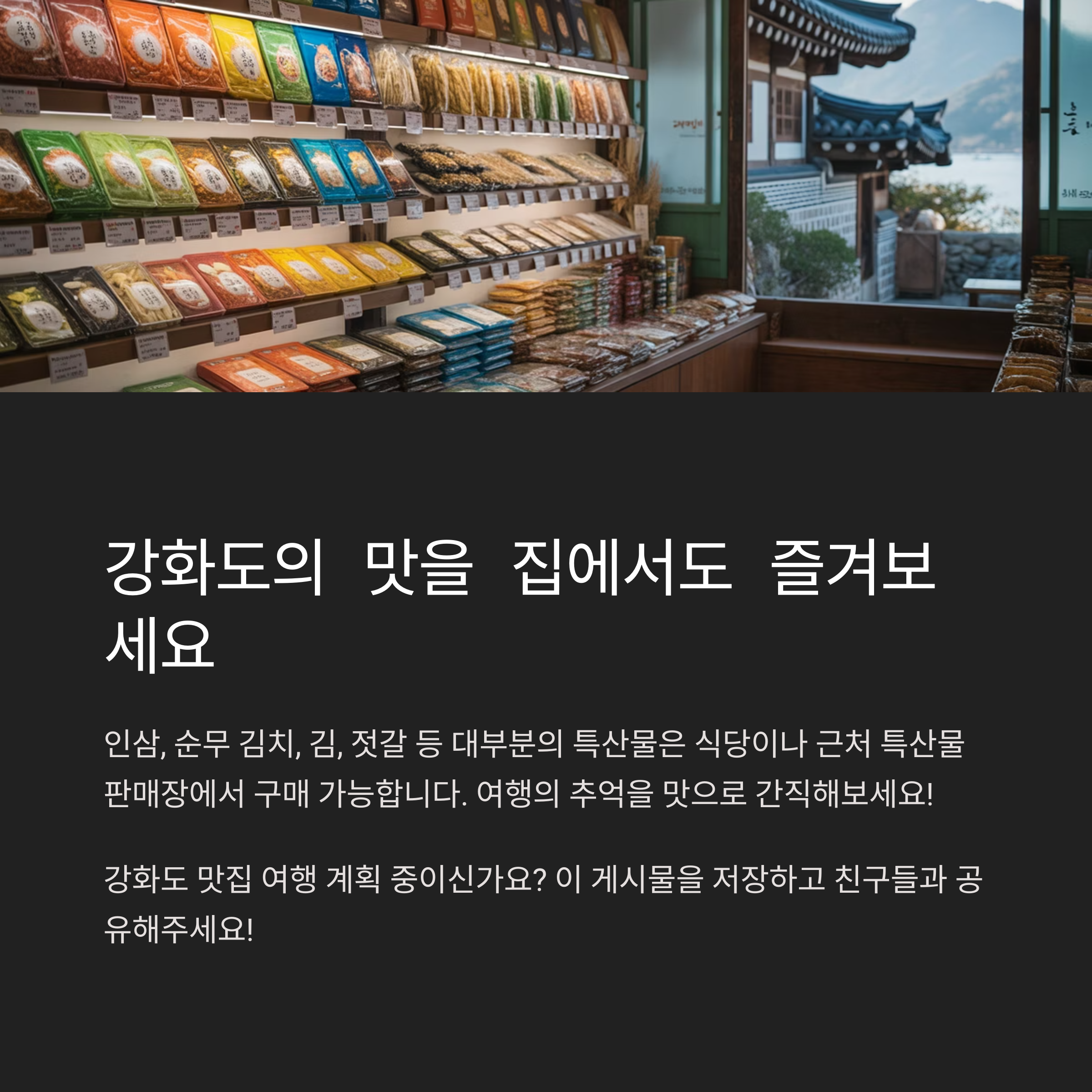 강화 인삼, 순무 김치, 김, 젓갈 등은 대부분 식당이나 근처 특산물 판매장에서 구매 가능합니다. 포장된 상품은 여행 선물로도 인기가 많습니다.