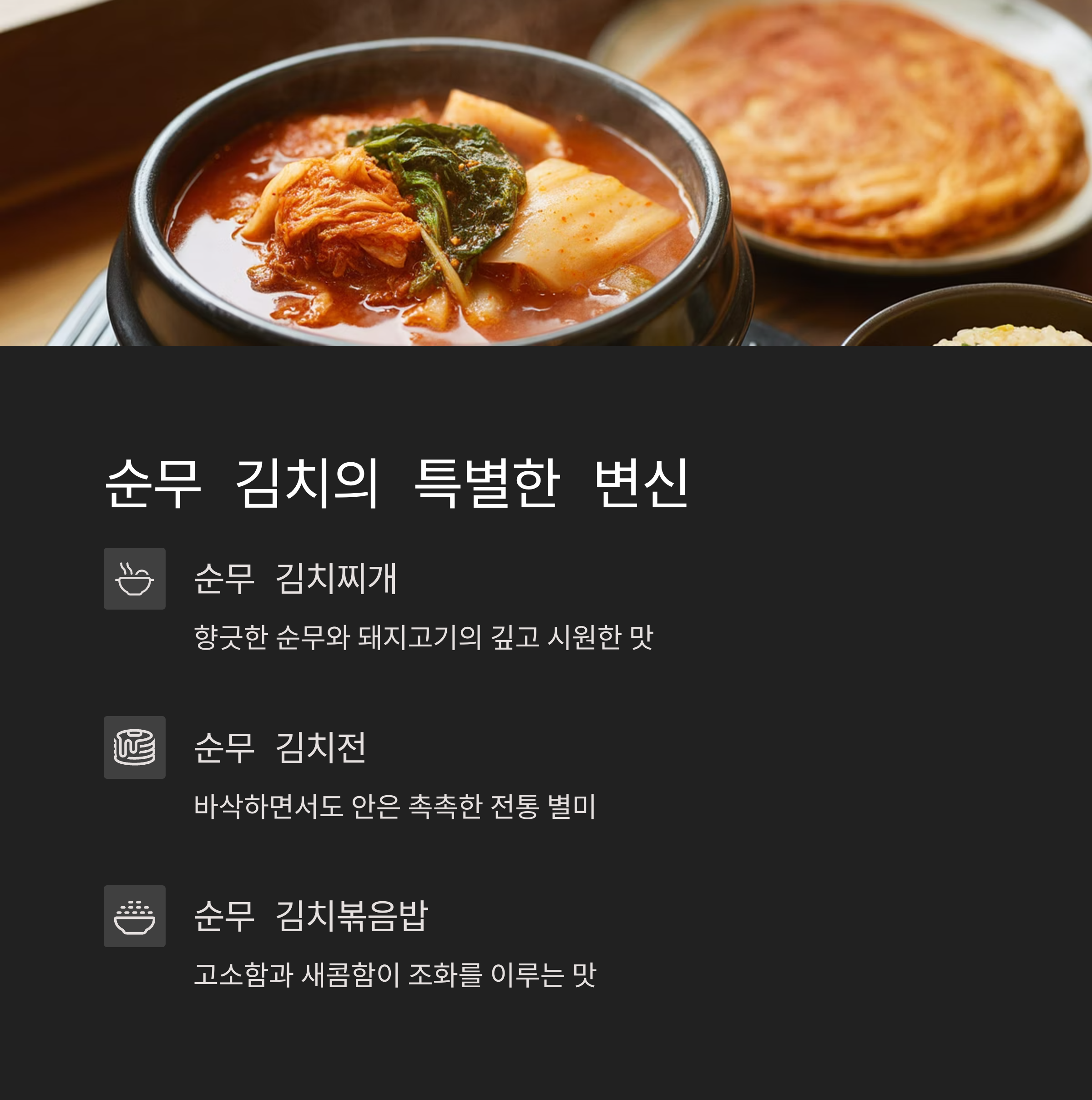 - 주요 메뉴: 순무 김치찌개 8,000원 / 순무 김치전 7,000원 / 순무 김치볶음밥 7,500원