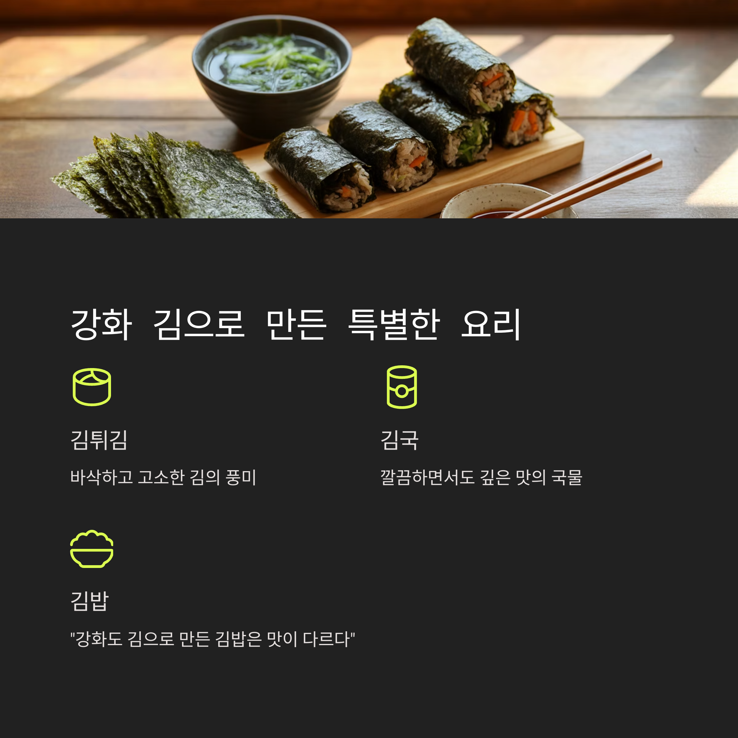 마지막으로 찾은 ‘강화김밥집’은 강화도의 특산물 김을 다양한 요리로 즐길 수 있는 곳이었습니다. 평소 김을 간단한 밥반찬으로만 생각했는데, 여기선 김튀김, 김국, 김밥 등 색다른 메뉴가 많아 신선했습니다. 김튀김은 바삭하고 고소하며 김의 풍미가 잘 살아 있었고, 김국은 깔끔하면서도 깊은 맛이 느껴졌습니다. 친구들도 “강화도 김으로 만든 김밥은 맛이 다르다”며 연신 감탄했어요. 소박하지만 특별한 한 끼로 여행을 마무리하기 딱 좋은 곳이었습니다.