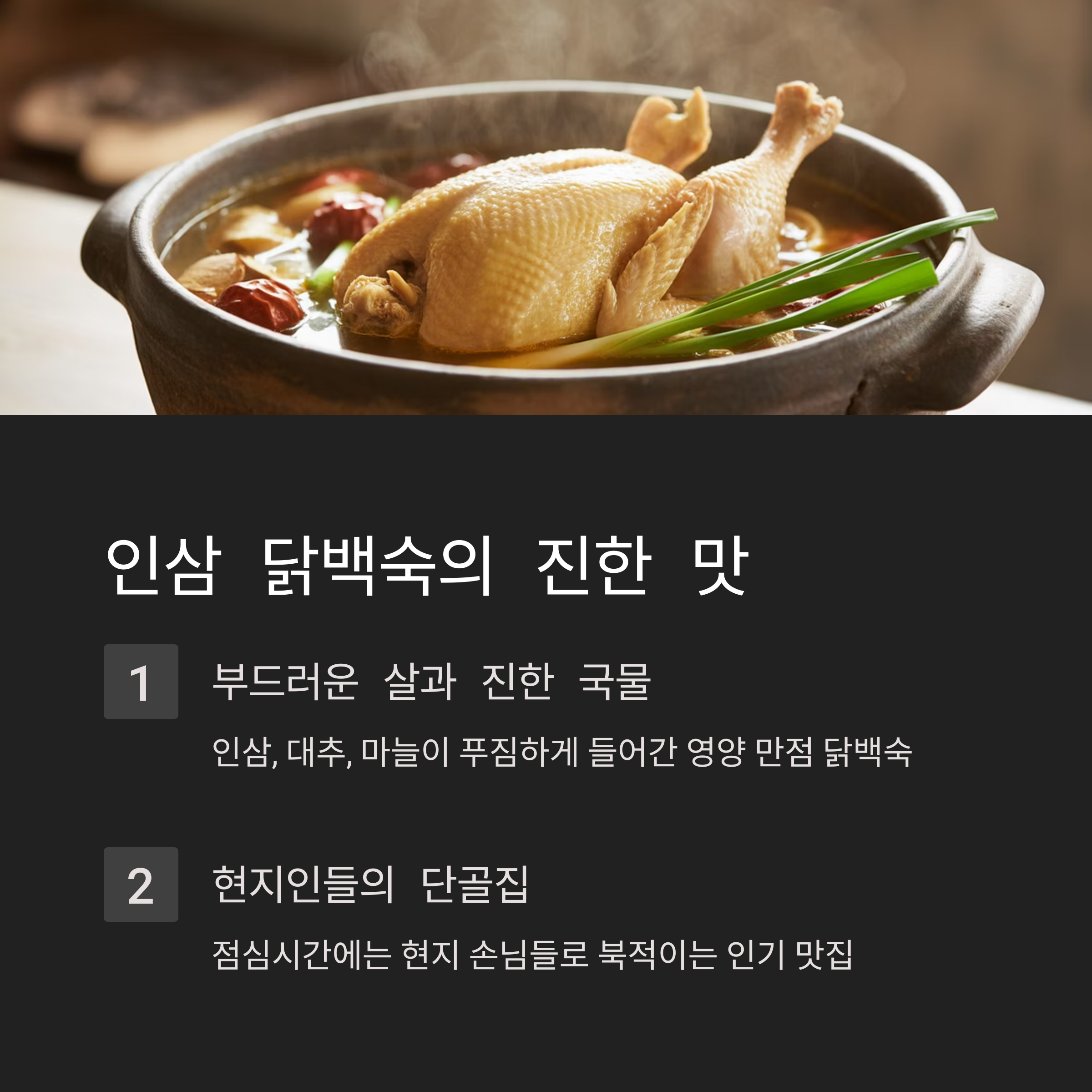 - 주요 메뉴: 인삼닭백숙 55,000원 / 오리백숙 60,000원