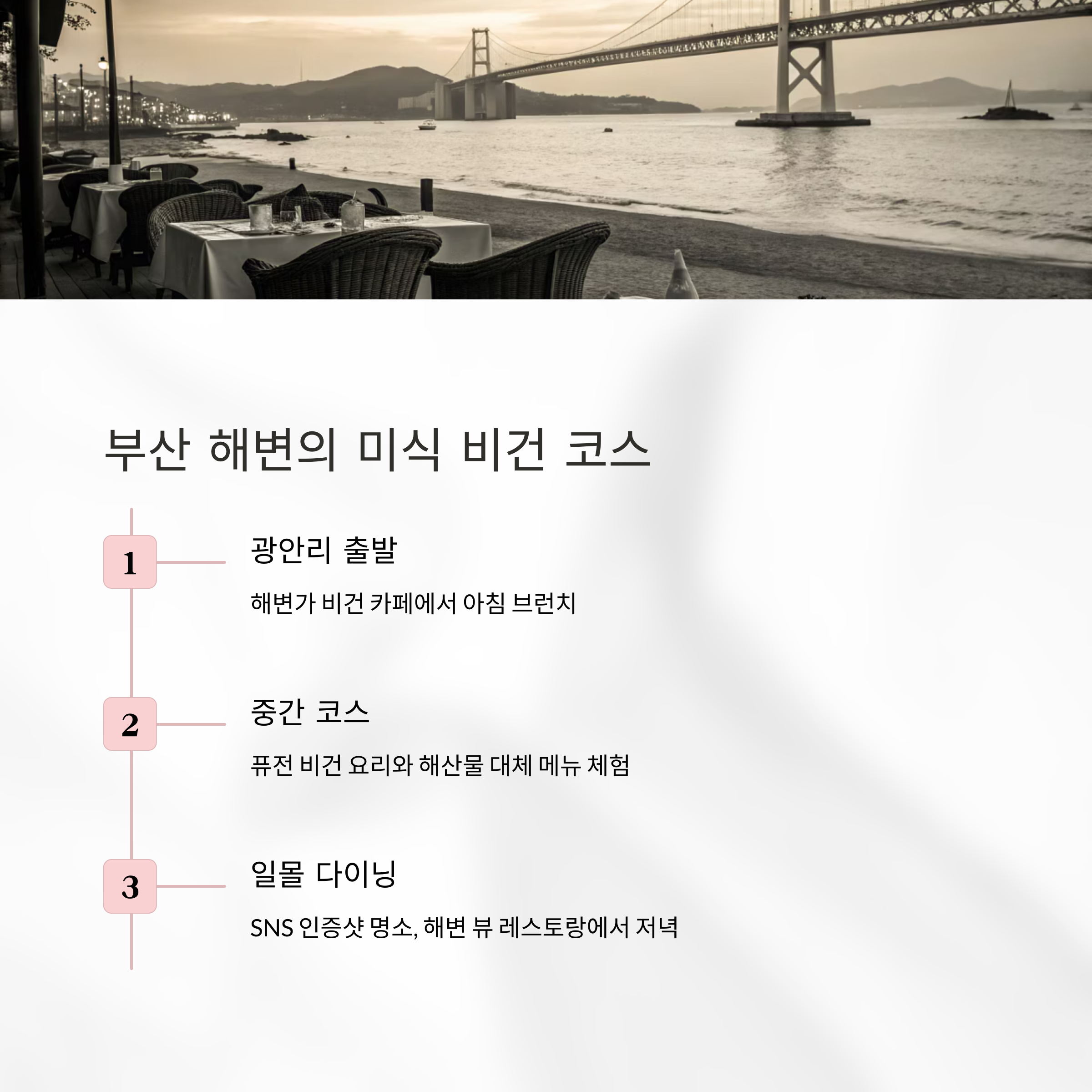 부산은 채식에 있어서도 독립적인 개성과 흐름을 보여줍니다. 광안리와 해운대에서는 비건 브런치 카페, 로컬 채소를 활용한 샐러드 바, 심지어 비건 수제버거까지 다양하게 접할 수 있습니다. 푸른 바다를 앞에 두고 즐기는 식물성 식단, 그 자체가 여행의 하이라이트가 되어줍니다.