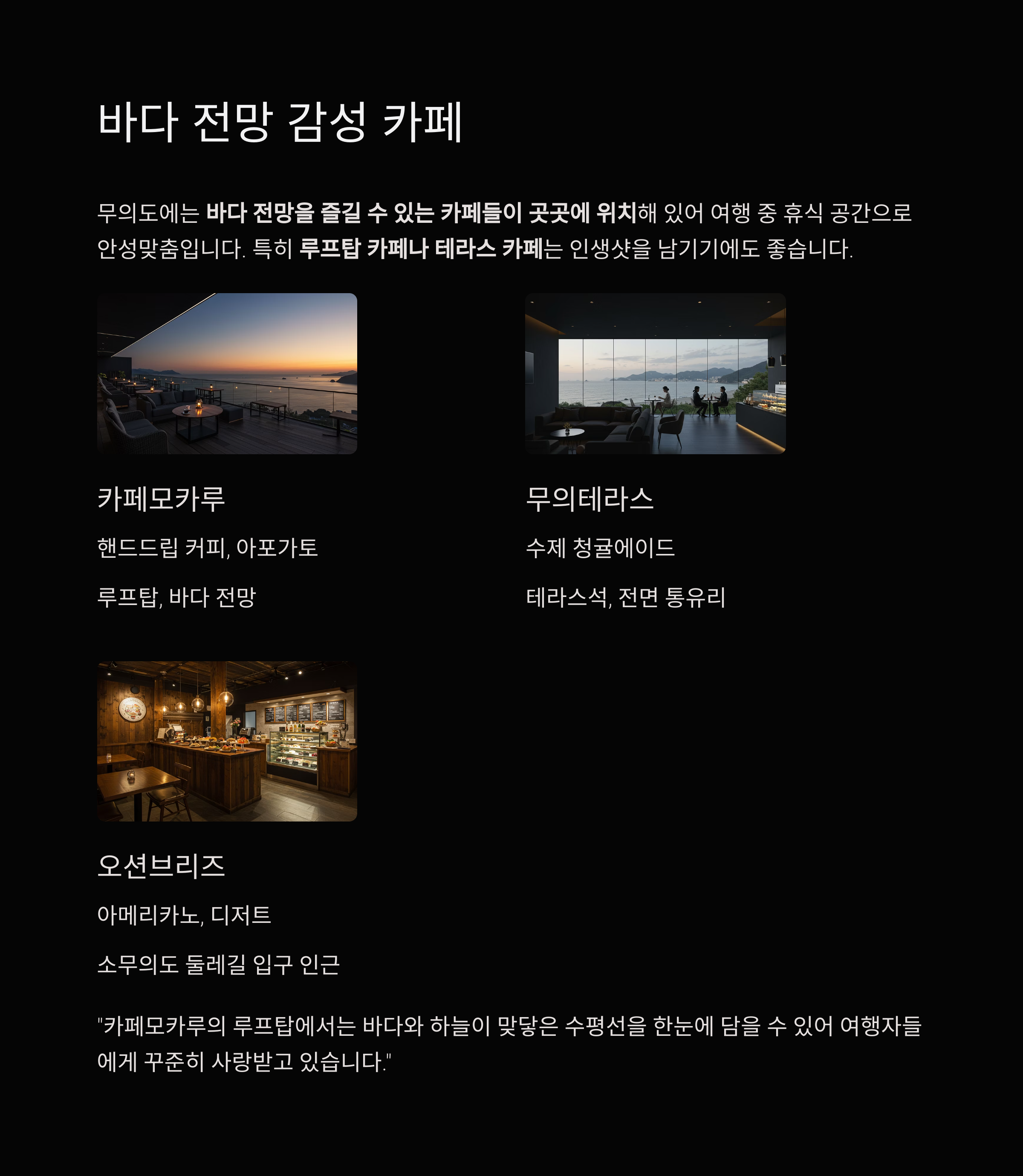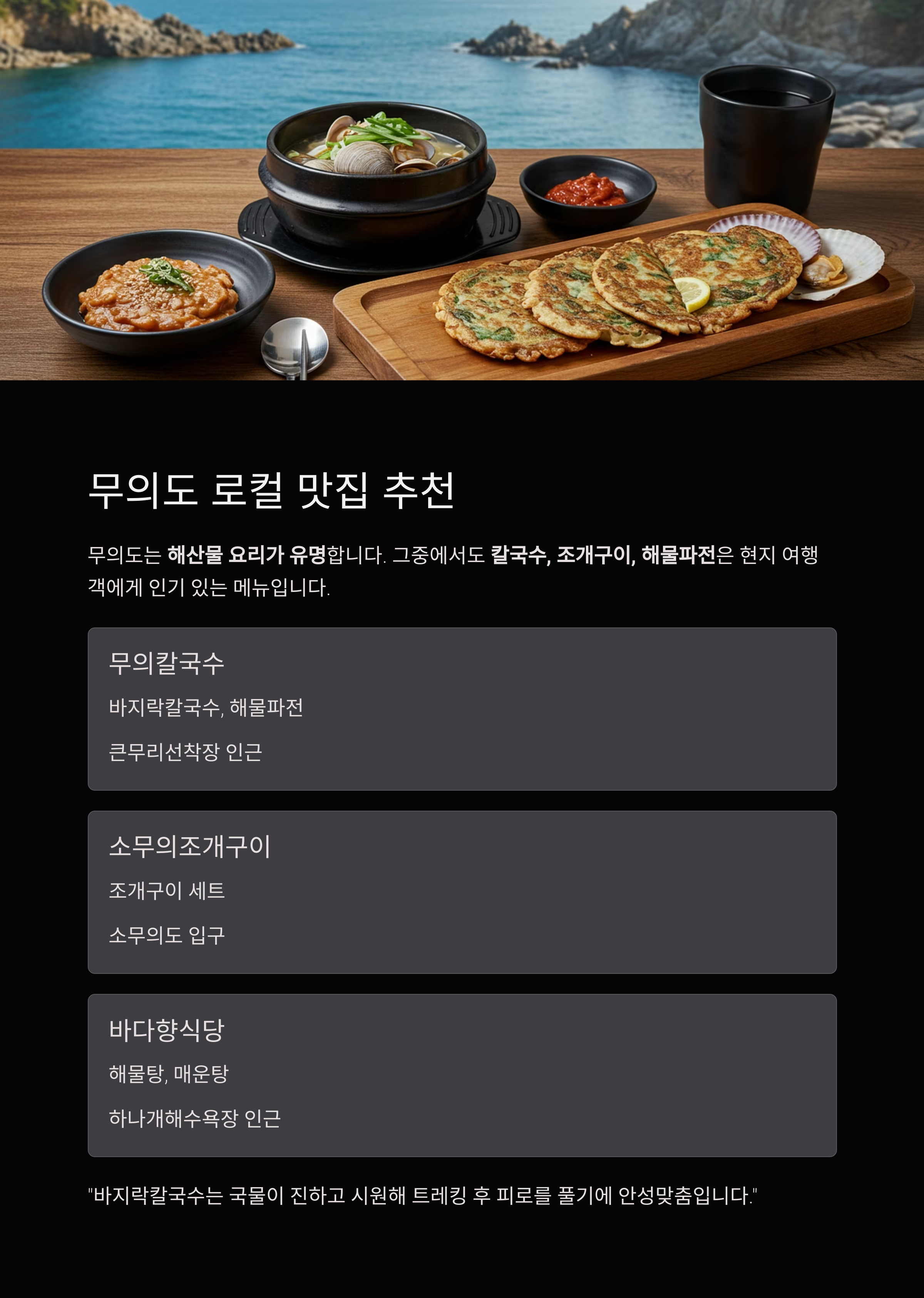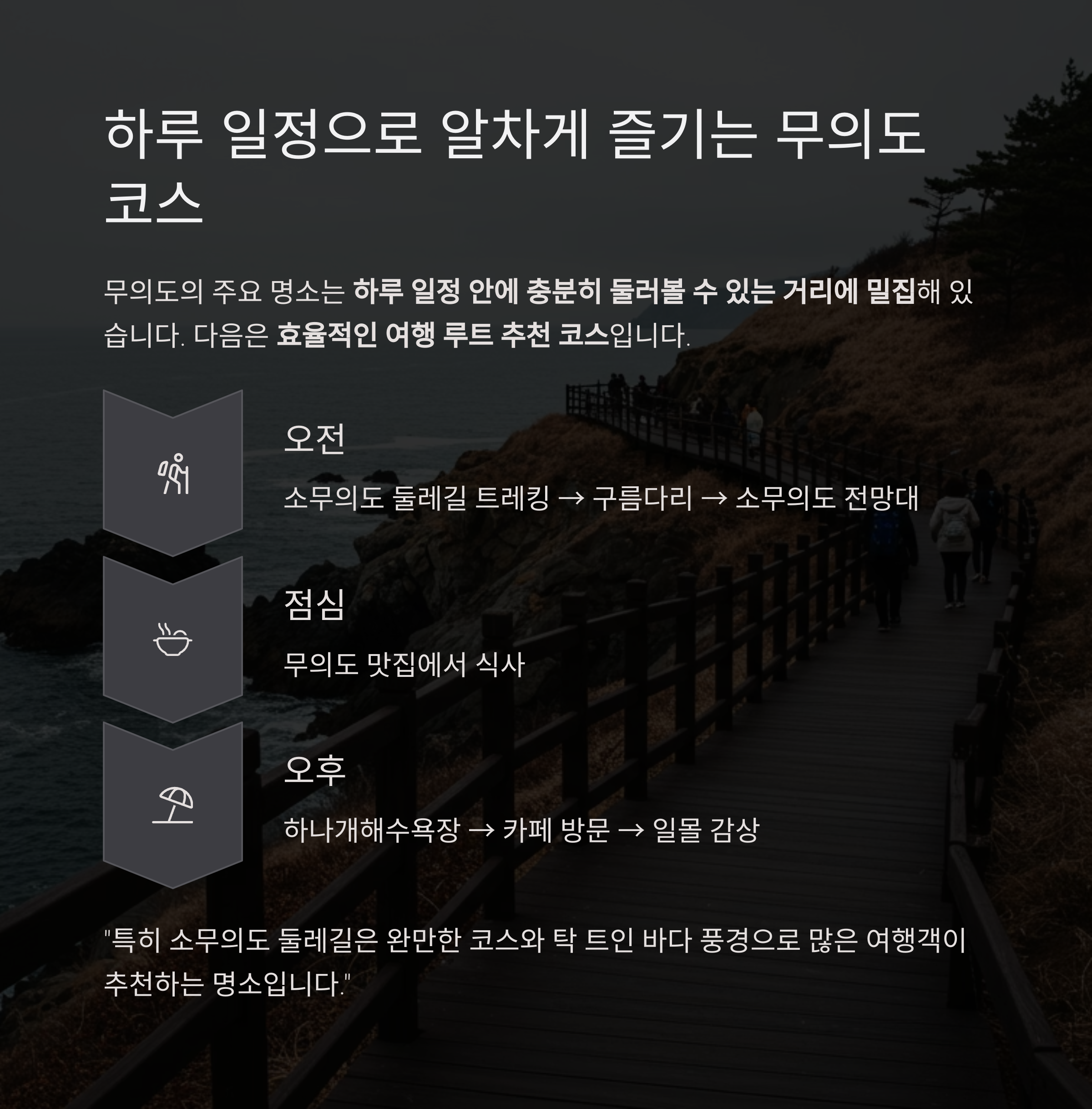 "특히 소무의도 둘레길은 완만한 코스와 탁 트인 바다 풍경으로 많은 여행객이 추천하는 명소입니다."