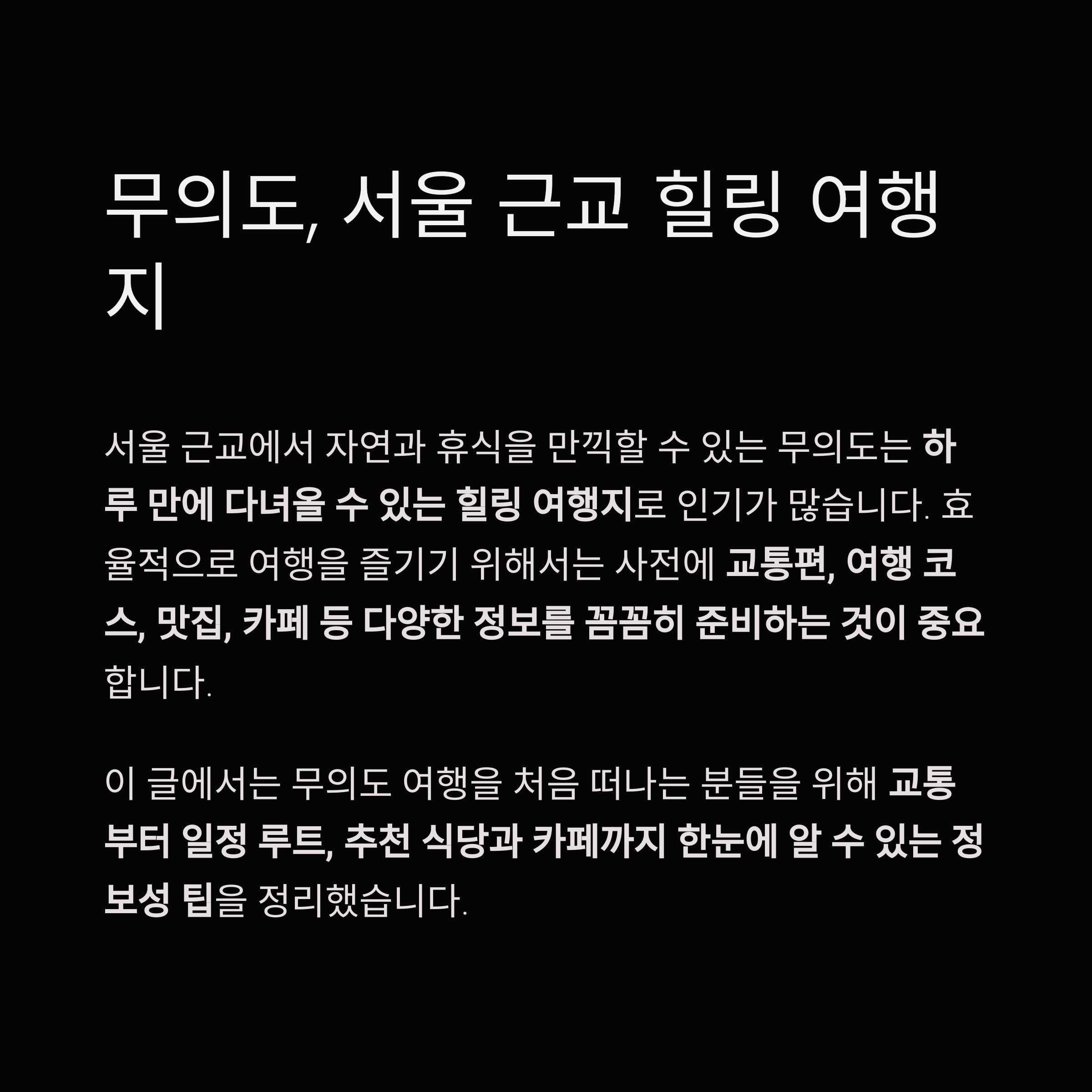 이 글에서는 무의도 여행을 처음 떠나는 분들을 위해 교통부터 일정 루트, 추천 식당과 카페까지 한눈에 알 수 있는 정보성 팁을 정리했습니다.