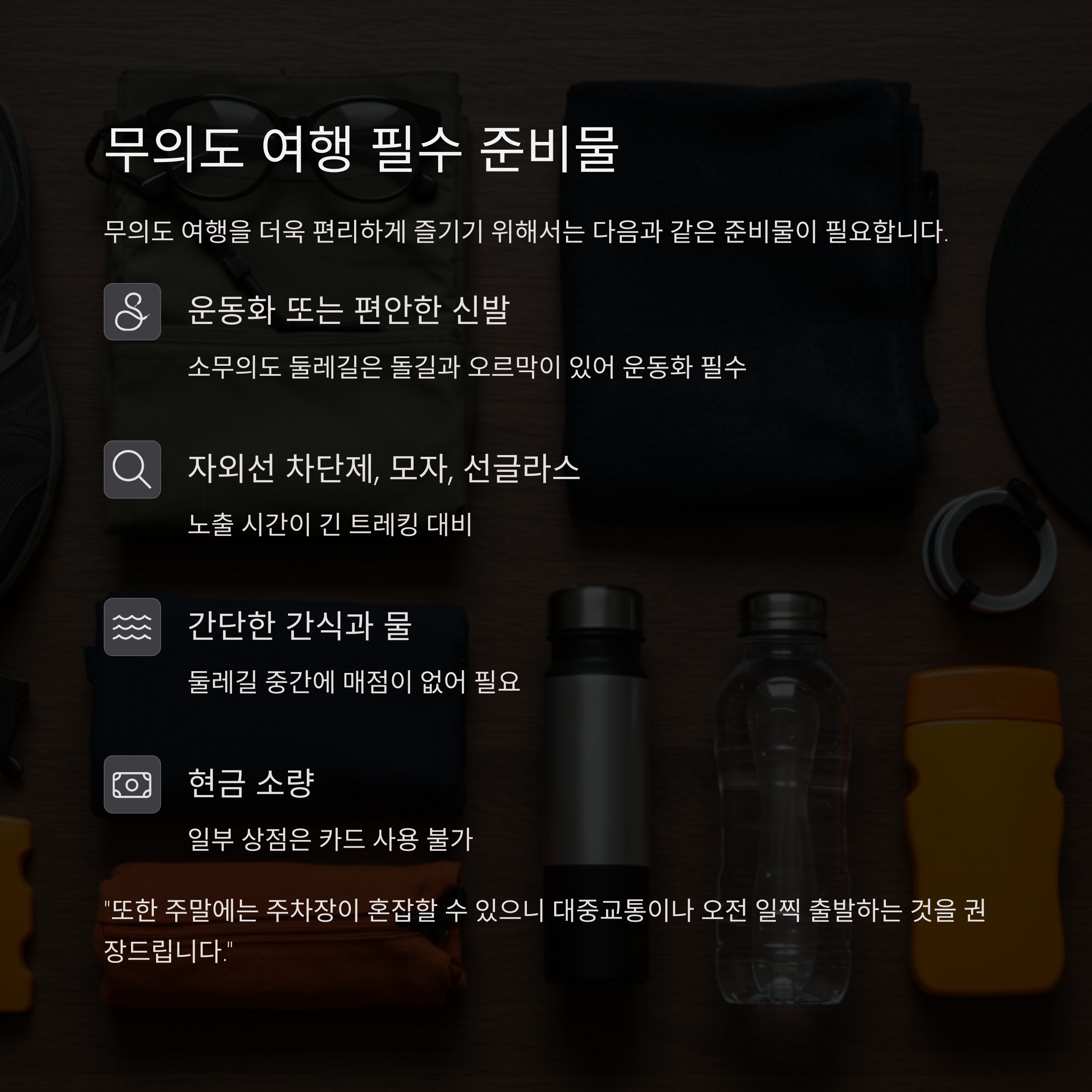 무의도 여행을 더욱 편리하게 즐기기 위해서는 다음과 같은 준비물이 필요합니다.