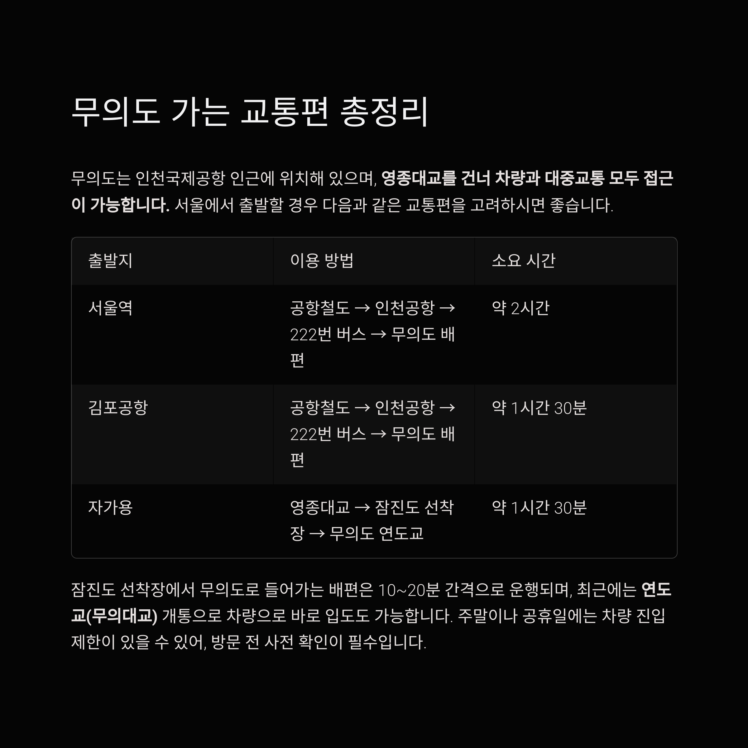 | 서울역 | 공항철도 → 인천공항 → 222번 버스 → 무의도 배편 | 약 2시간 |