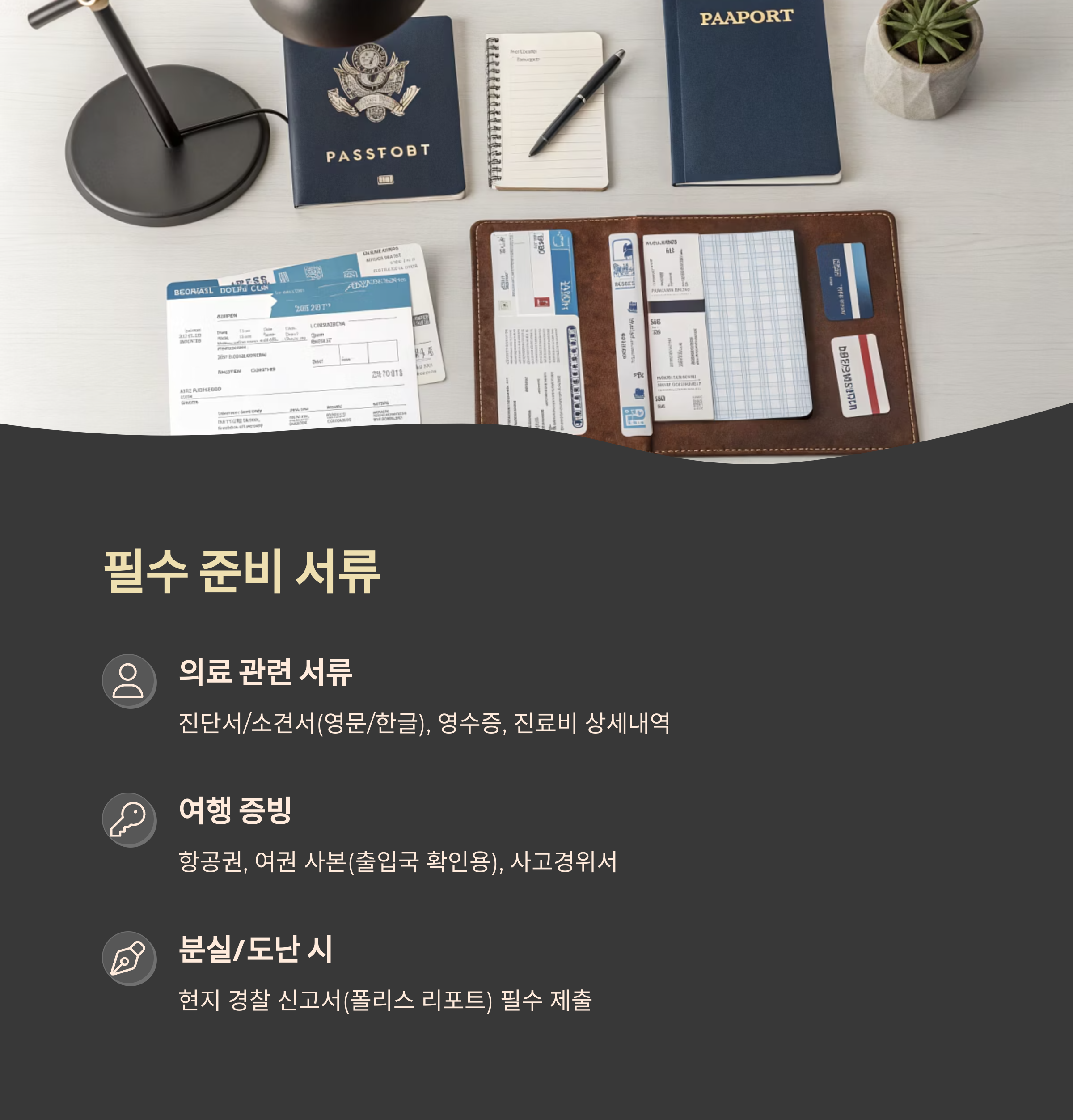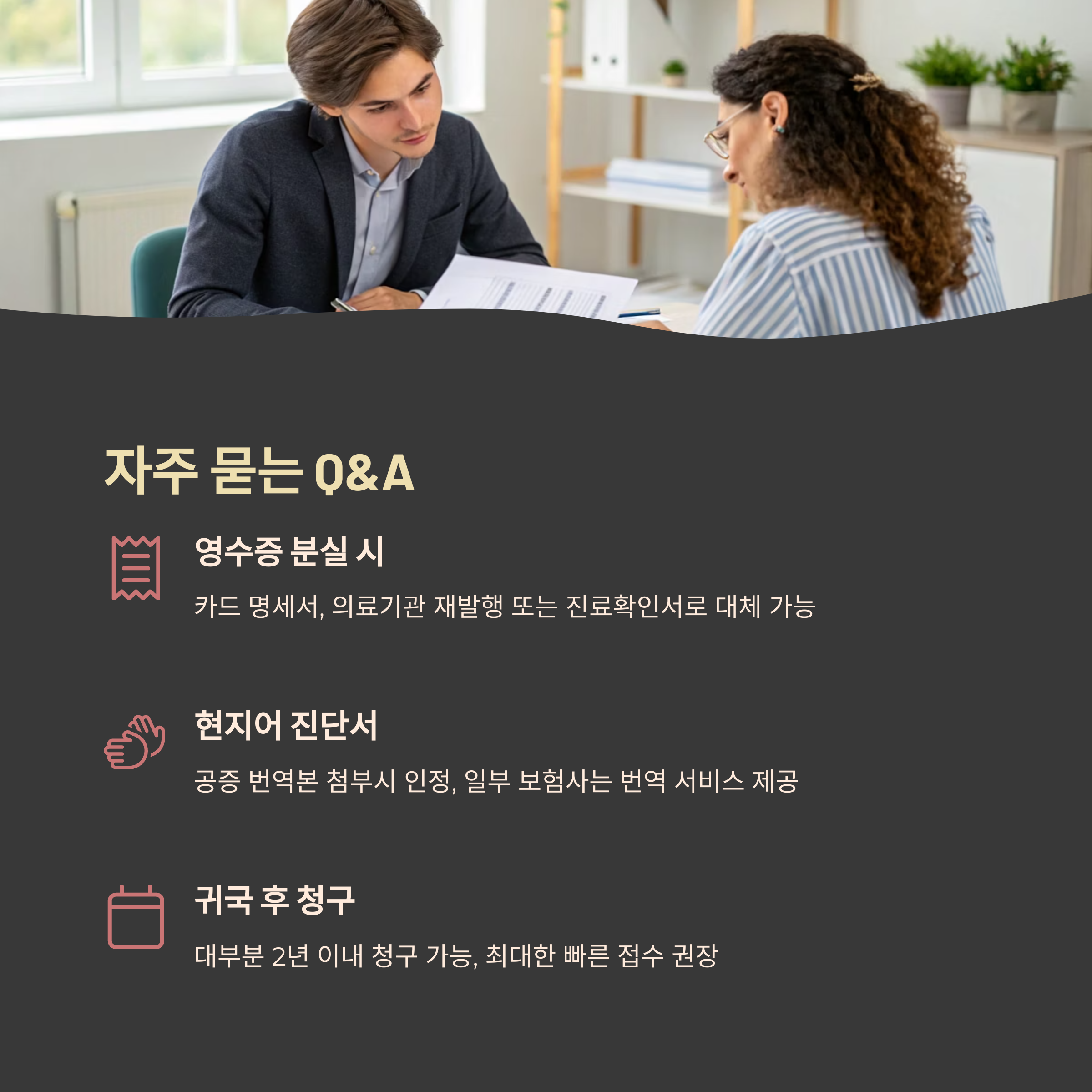 진단서, 치료비 영수증, 약 처방전, 병원명 기재된 명세서가 필수입니다. 영문 또는 현지어 원본도 가능하니, 퇴원 전에 꼭 요청하세요.