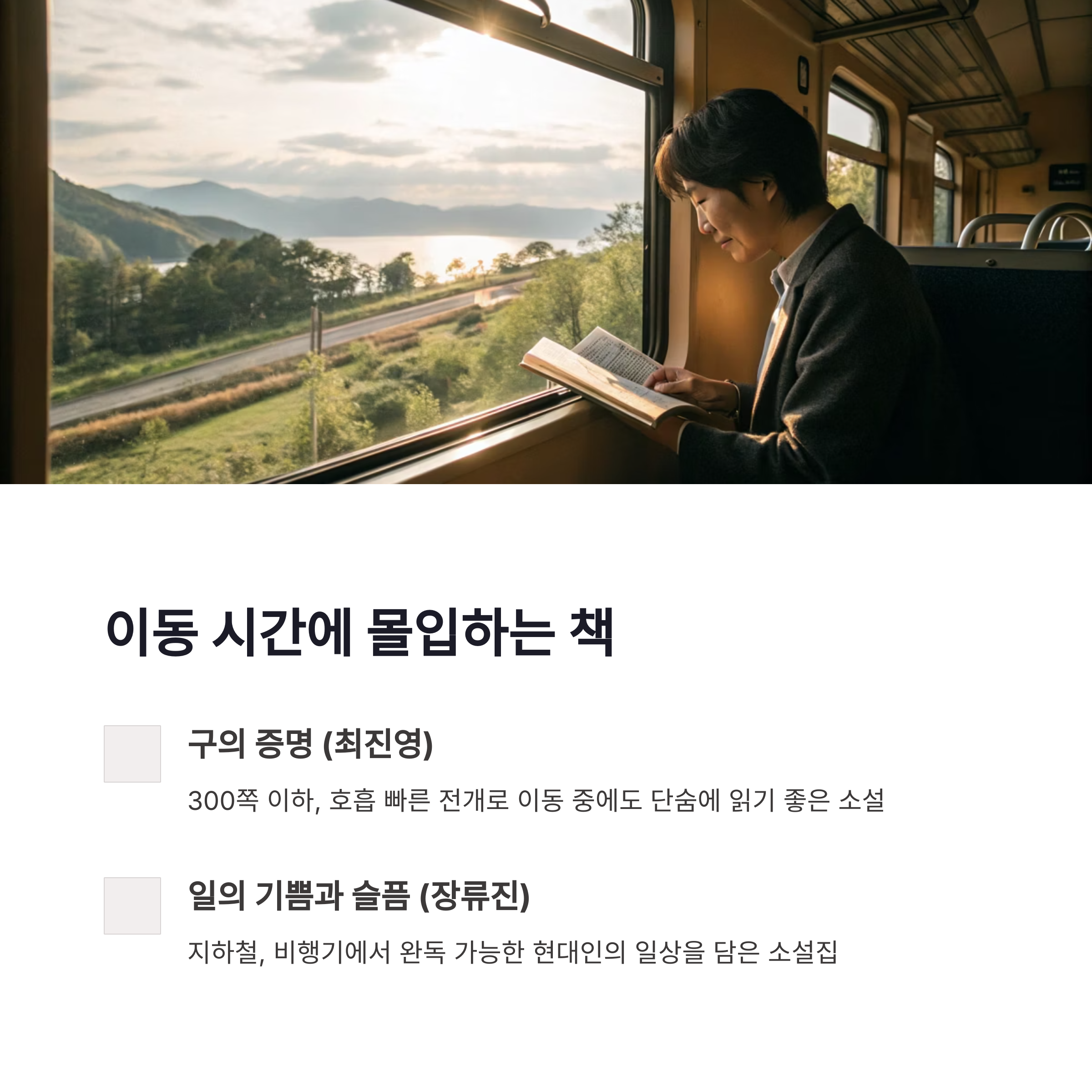 이동하는 동안 책 한 권을 펼치는 것만으로도 여행은 훨씬 풍성해집니다.