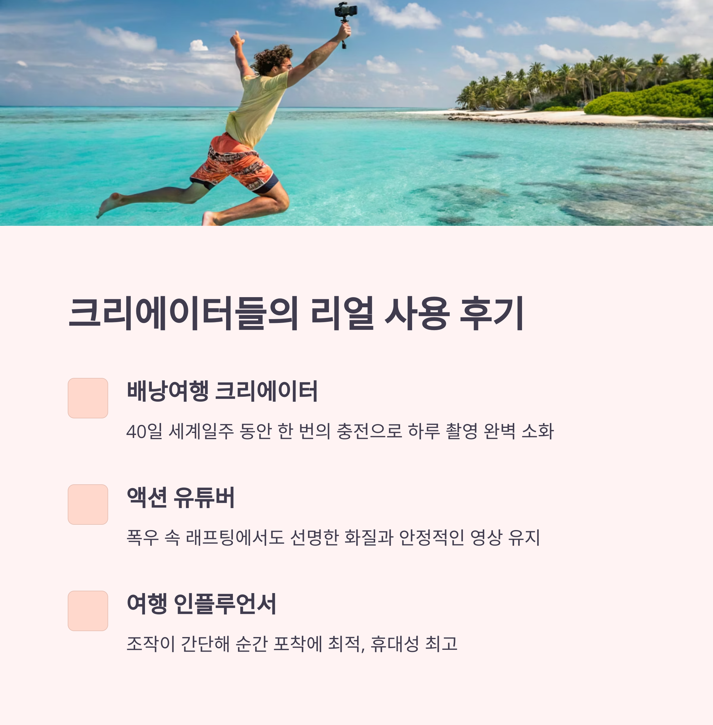 🎥 작고 가벼움 주머니에 쏙! 무게 부담 ZERO 🌊 방수/방진 물놀이, 비 오는 날 촬영 가능 📷 고화질 4K~5.3K 영상, 손떨림 방지 기능 탑재 🔋 배터리 여유 여행 하루 정도는 충분히 커버 가능