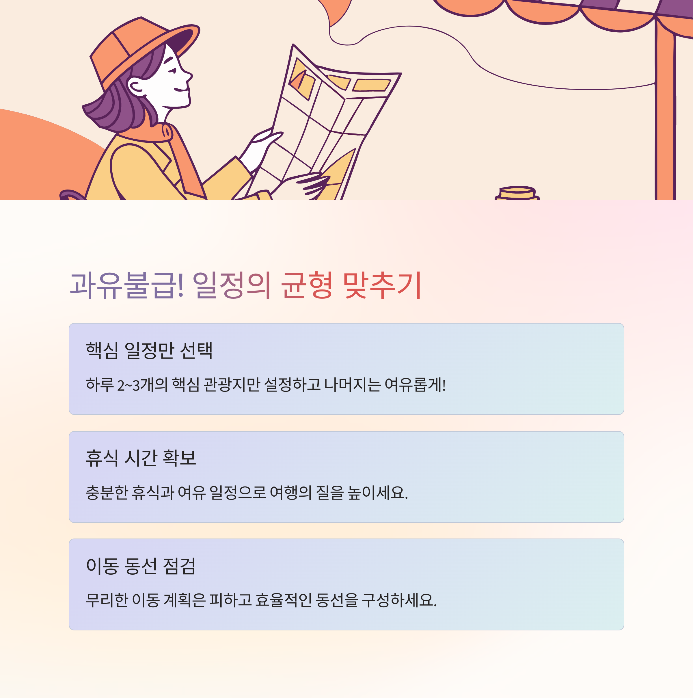 과도한 이동과 빠듯한 시간표는 여행 피로도를 높이고, 여행 자체를 즐길 여유를 없애게 됩니다. 꼭 우선순위를 정해 최소화하세요.