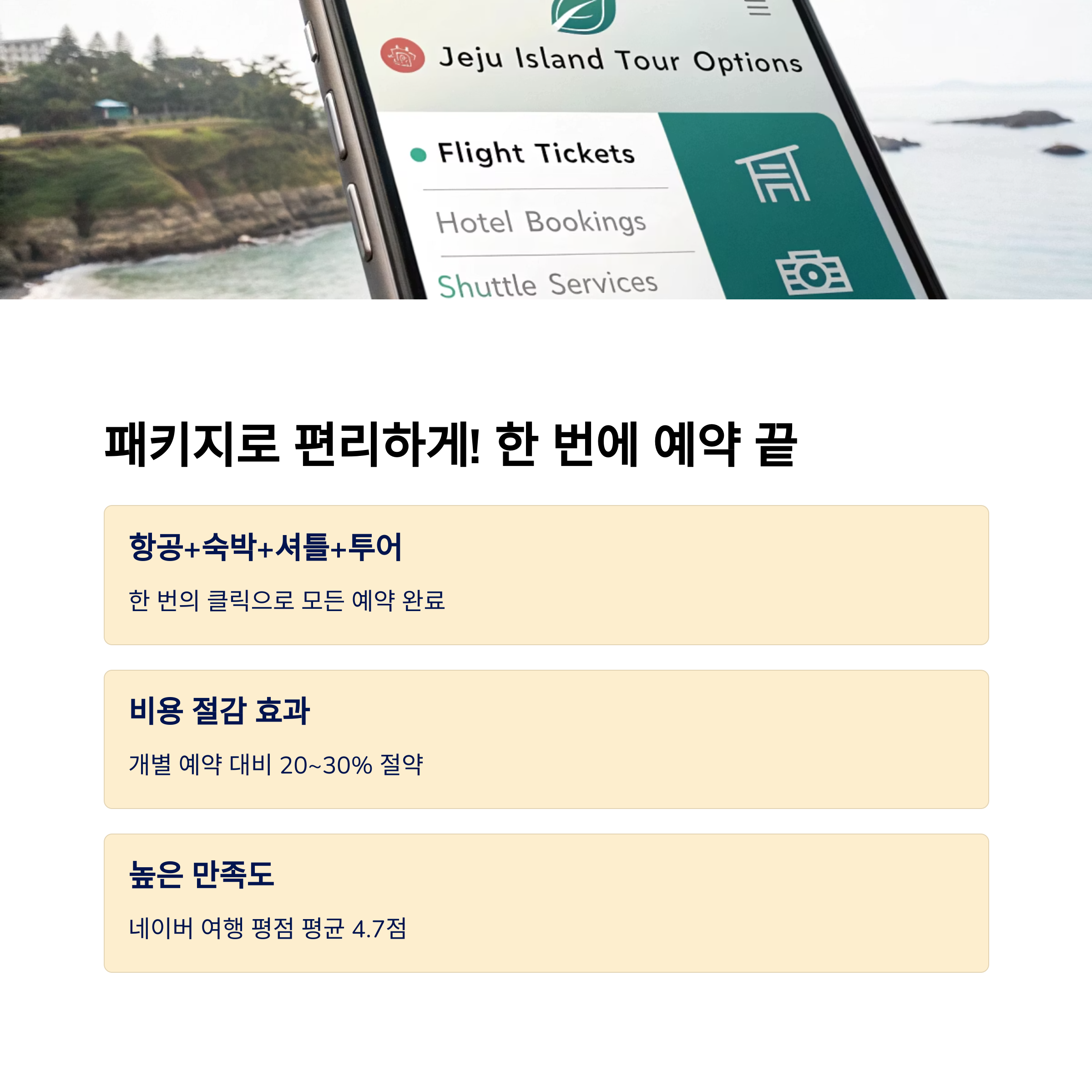 최근에는 항공권 + 숙소 + 투어가 결합된 제주 패키지 상품이 다양하게 등장하면서, 렌트 없이도 알차고 저렴한 여행이 가능해졌습니다.