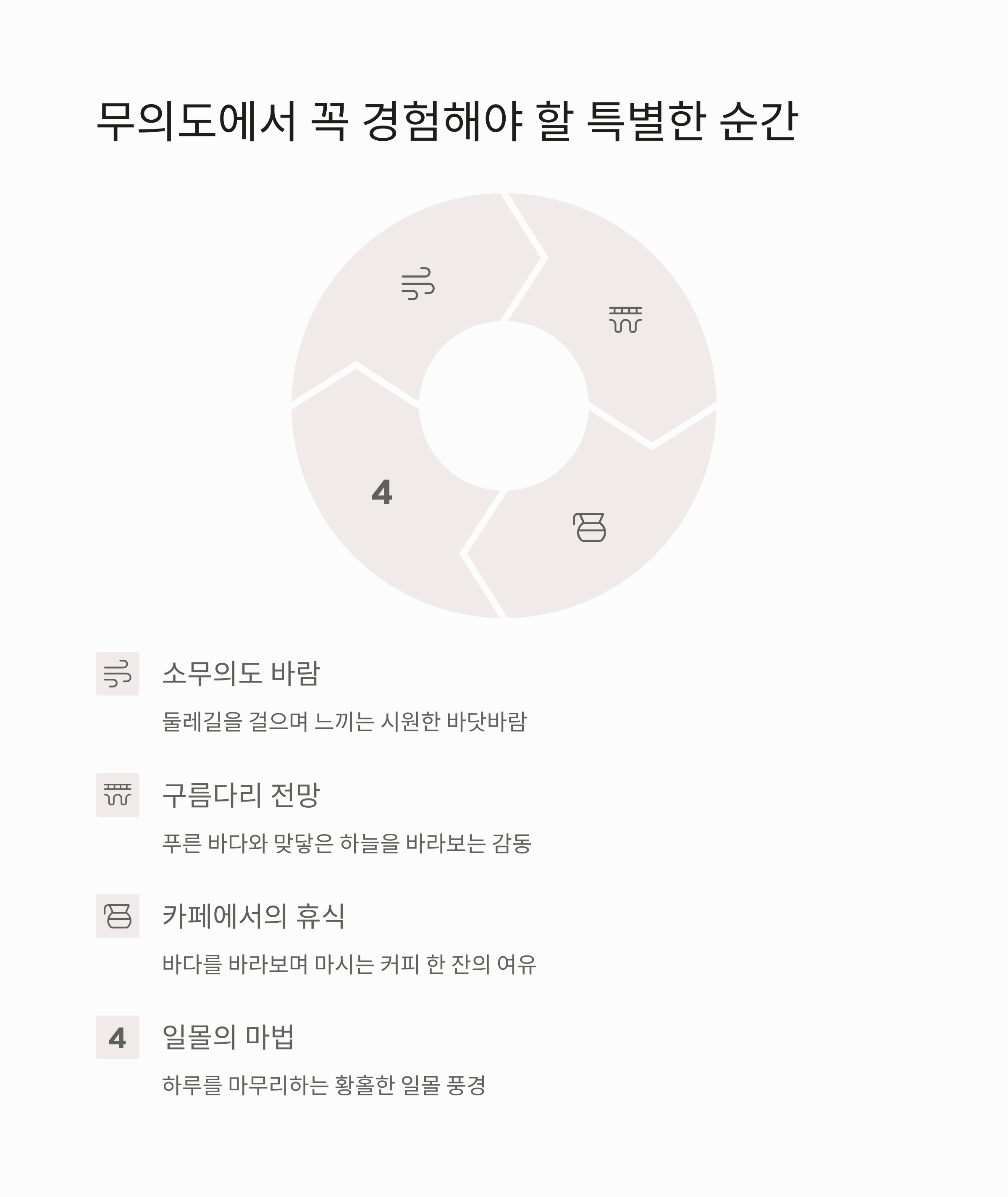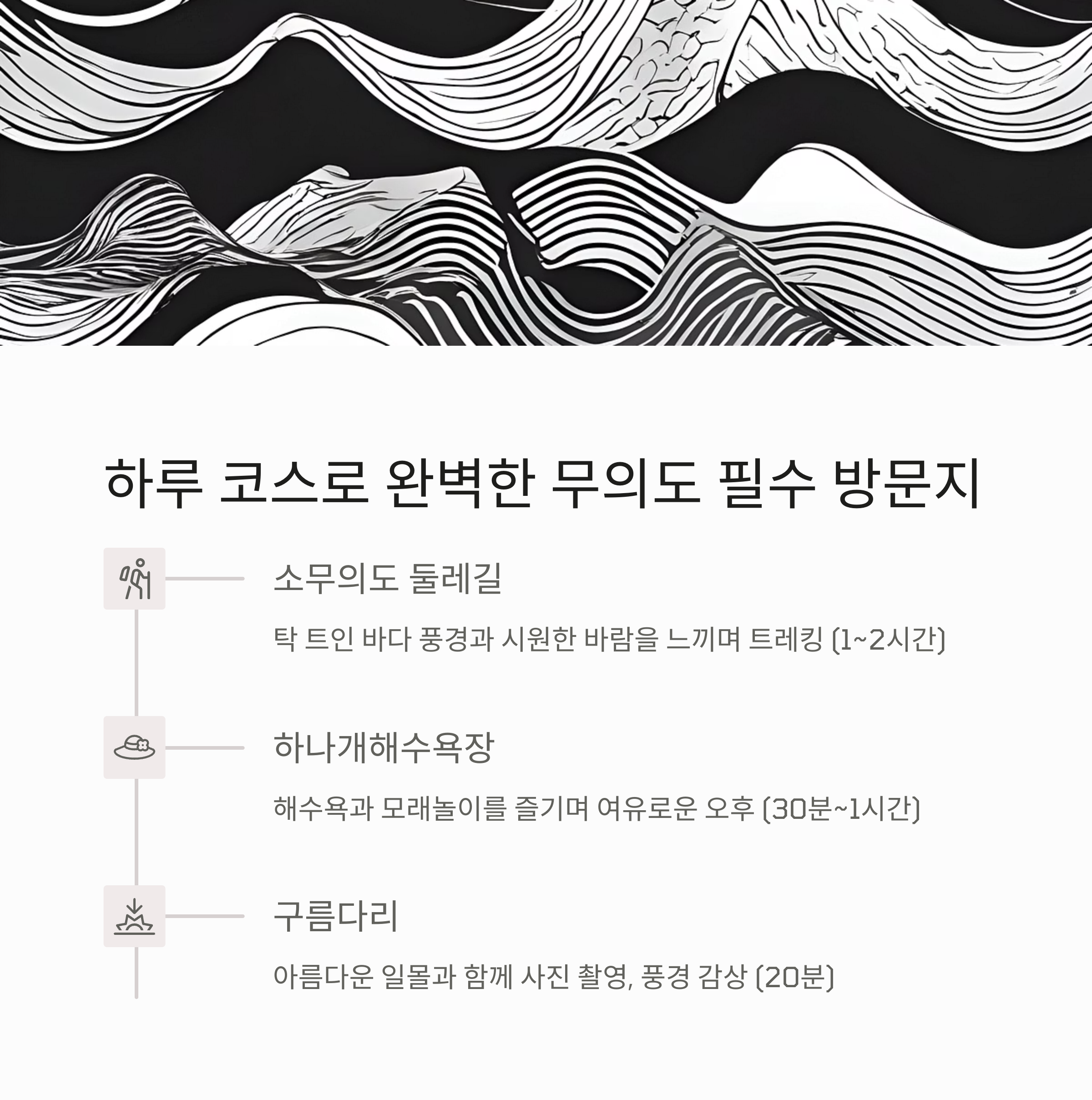 이 코스를 기준으로 오전에 소무의도를 걸은 뒤, 오후에는 하나개해수욕장에서 여유를 즐기고 구름다리에서 일몰을 감상하면 완벽한 하루 일정이 완성됩니다.