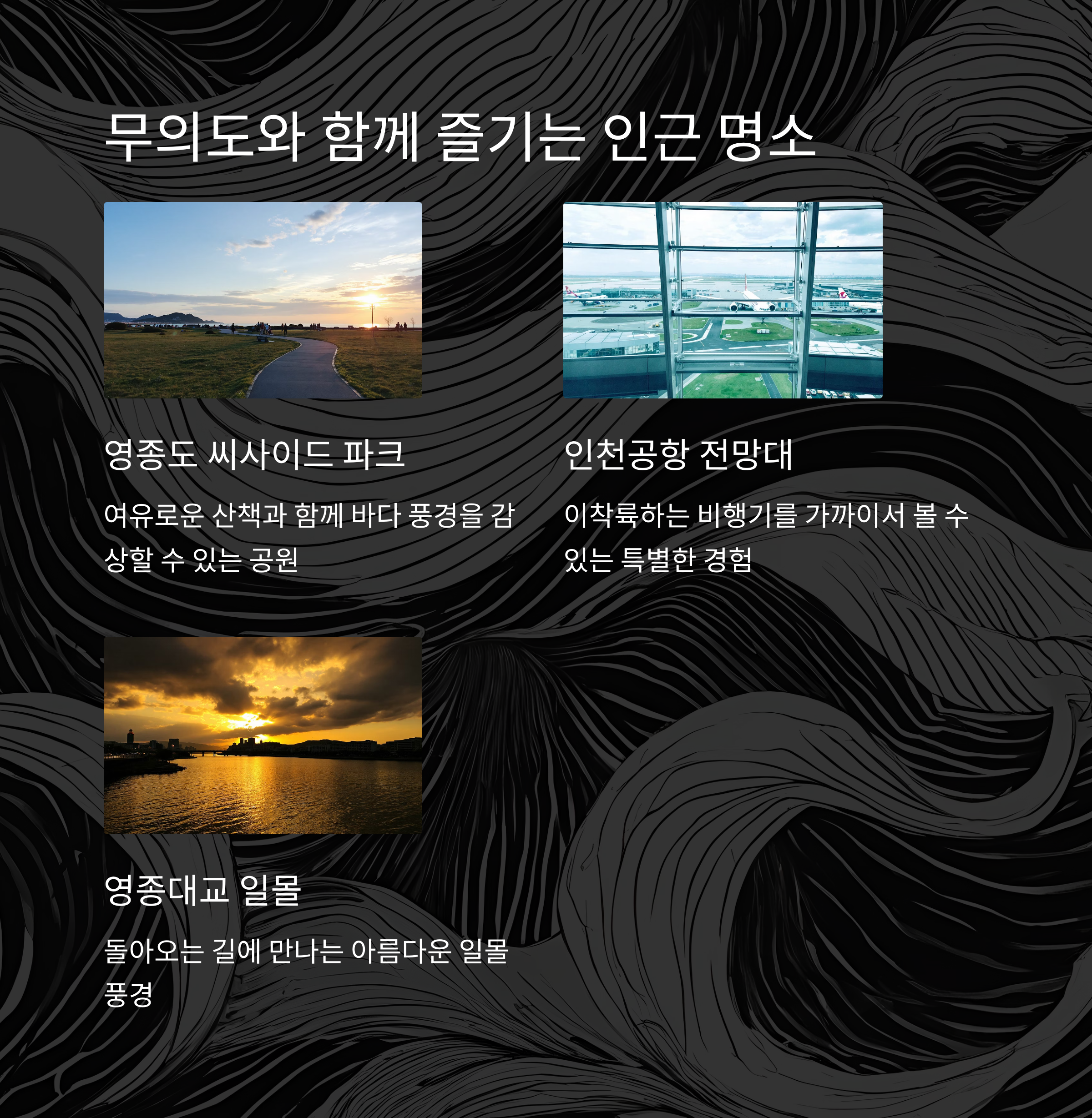무의도 여행 후 시간이 남는다면, 영종도의 씨사이드 파크나 인천공항 전망대도 함께 들러보길 추천드립니다.