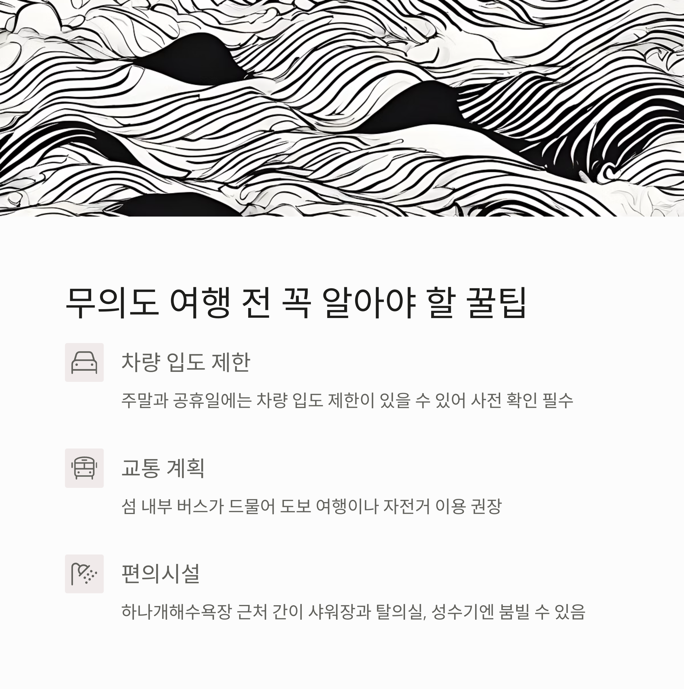 무의도는 차량으로 이동이 가능하지만, 주말과 공휴일에는 차량 입도 제한이 있을 수 있어 사전 확인이 중요합니다.