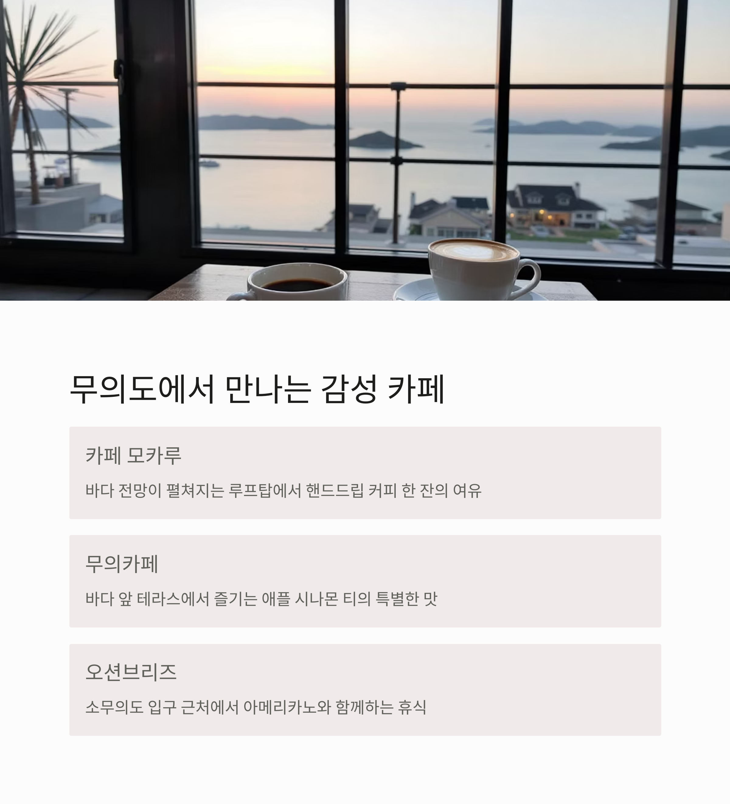 맑은 바다와 탁 트인 풍경, 그리고 개성 넘치는 카페들이 조화를 이루어 하루 동안에도 자연과 감성, 미식을 모두 경험할 수 있는 곳으로 사랑받고 있습니다.