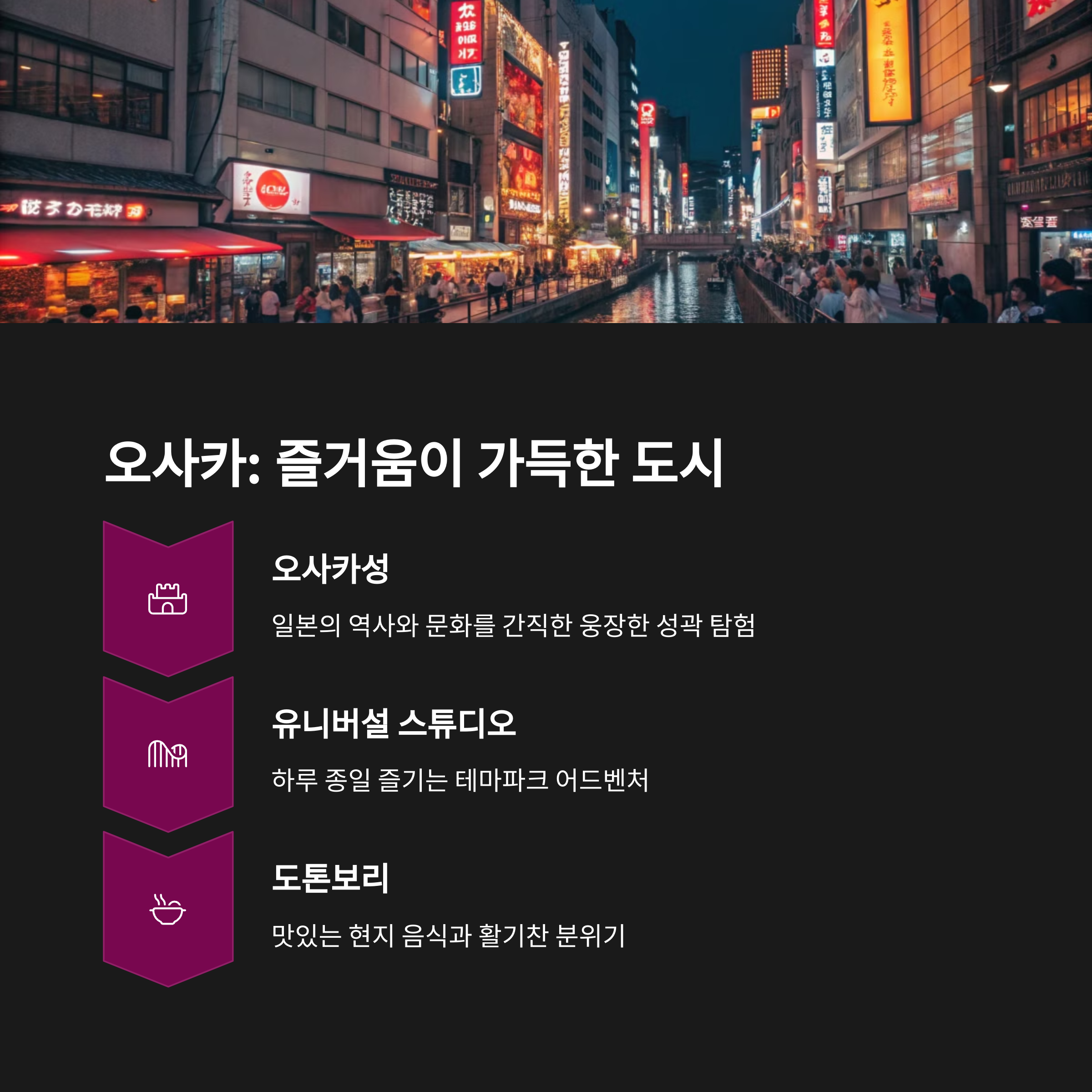 오사카는 ‘먹방의 성지’로 불릴 만큼 맛집 천국이에요. 도톤보리의 타코야키, 오코노미야키, 쿠시카츠 등 먹고 또 먹어도 질리지 않는 길거리 음식이 넘쳐나죠. 그리고 빠질 수 없는 ‘유니버설 스튜디오 재팬(USJ)’! 해리포터 존에서 마법사 코스프레도 해보고, 미니언들과 사진도 찍고, 롤러코스터 타며 스트레스 한 방에 날리는 일정이죠. 아래 표에서 대표 일정 구성을 참고해보세요.