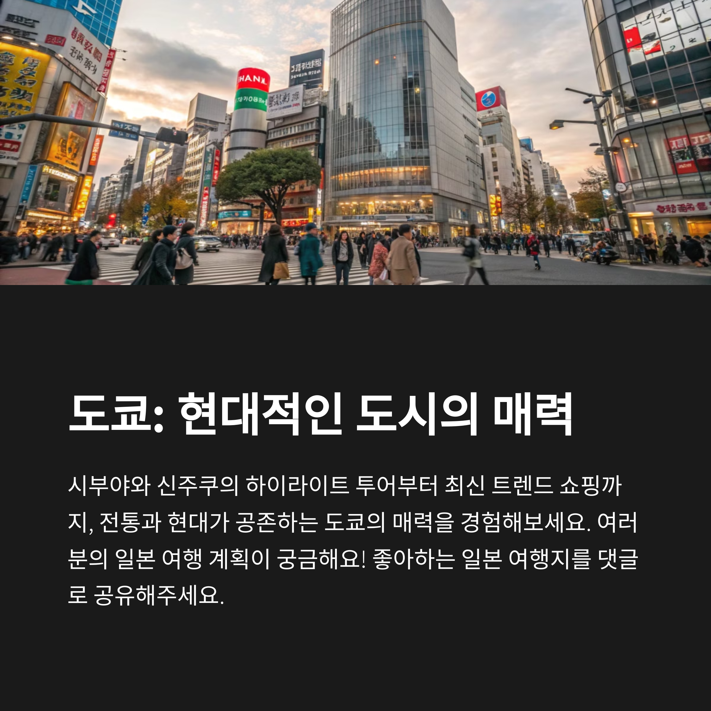 도쿄는 워낙 볼거리가 많아서 혼자 가면 시간 순삭! 그래서 패키지로 이동 동선까지 짜여 있는 일정이 꽤 유용하답니다. ‘시부야’의 스크램블 교차로, ‘아사쿠사’의 센소지, ‘하라주쿠’의 유니크 쇼핑거리 등 전통과 현대가 공존하는 도쿄의 진짜 매력을 콤팩트하게 느낄 수 있어요. 아래 리스트는 대표 스팟이에요.