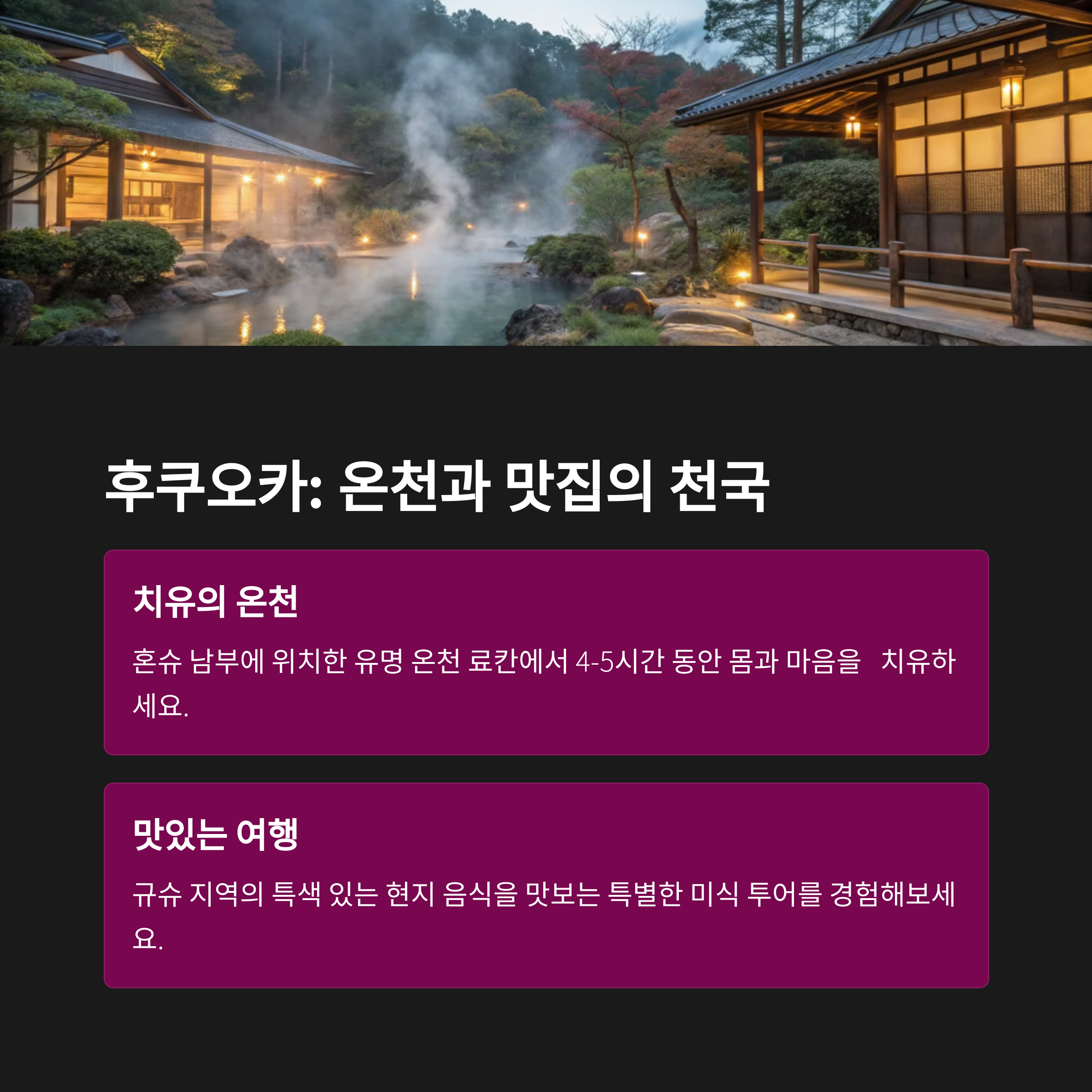 후쿠오카는 패키지 여행 초심자에게 딱 맞는 도시예요. 비행기로 1시간 30분이면 도착하는 가까운 거리, 아기자기한 시내, 그리고 유명한 온천지 '벳푸'와 '유후인'이 가까이 있어 힐링 여행에 최적화되어 있죠. 후쿠오카 시내에서 시작해 유후인에서 전통 료칸 체험, 벳푸에서 족욕과 지옥온천 투어를 하는 일정은 진짜 ‘찐 행복’ 그 자체. 특히 겨울철에는 따끈한 온천과 눈 덮인 산을 배경으로 찍는 인생샷, 놓치지 마세요.