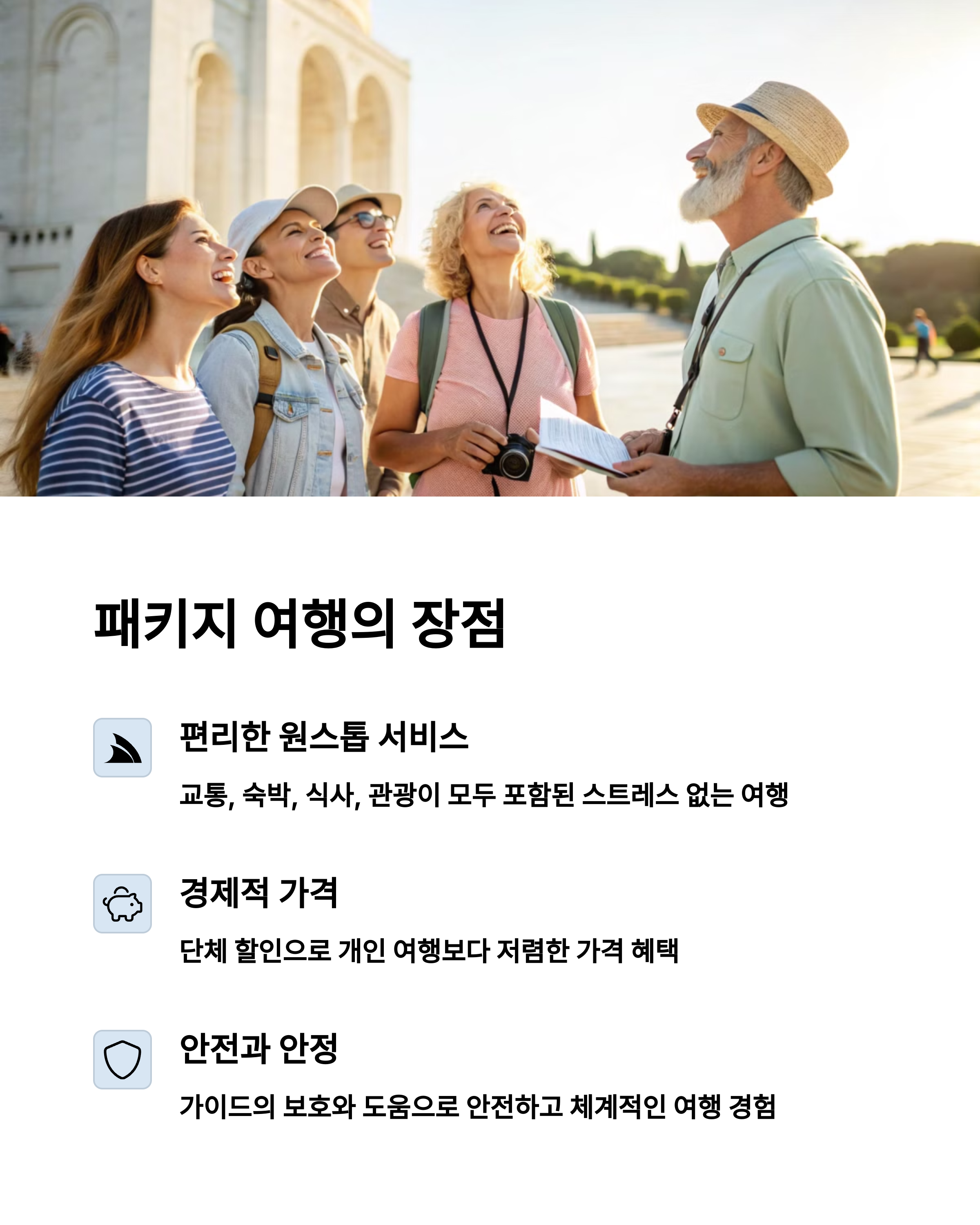 - 패키지 여행 장점: 여행사 지원, 효율적인 시간 활용, 안전 보장