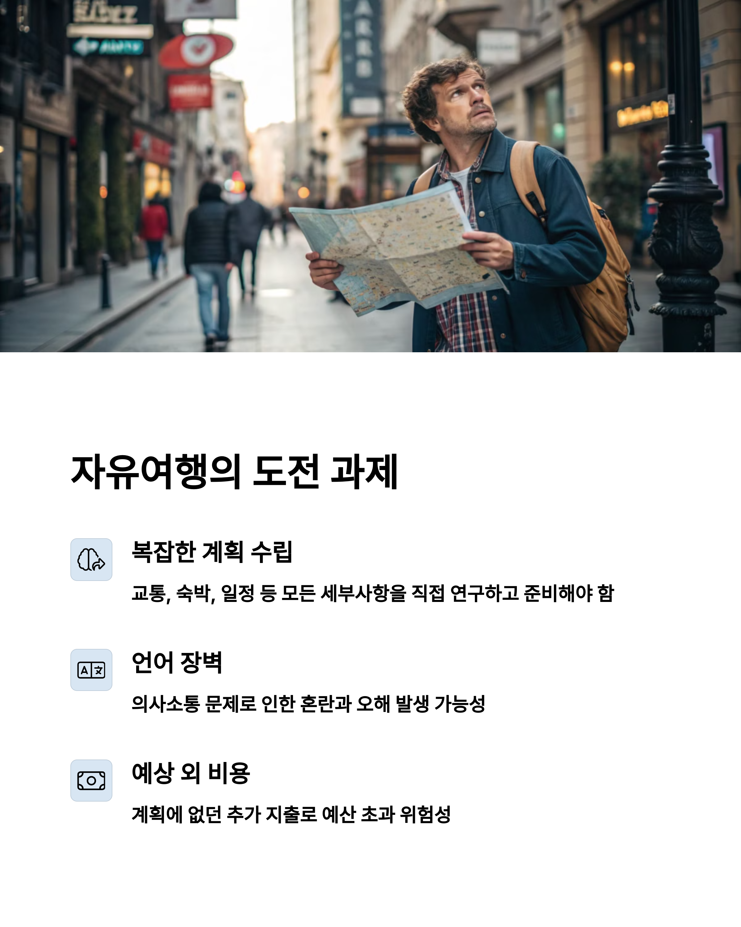 - 자유여행 단점: 준비 시간 많음, 언어·길 찾기 어려움, 안전 부담