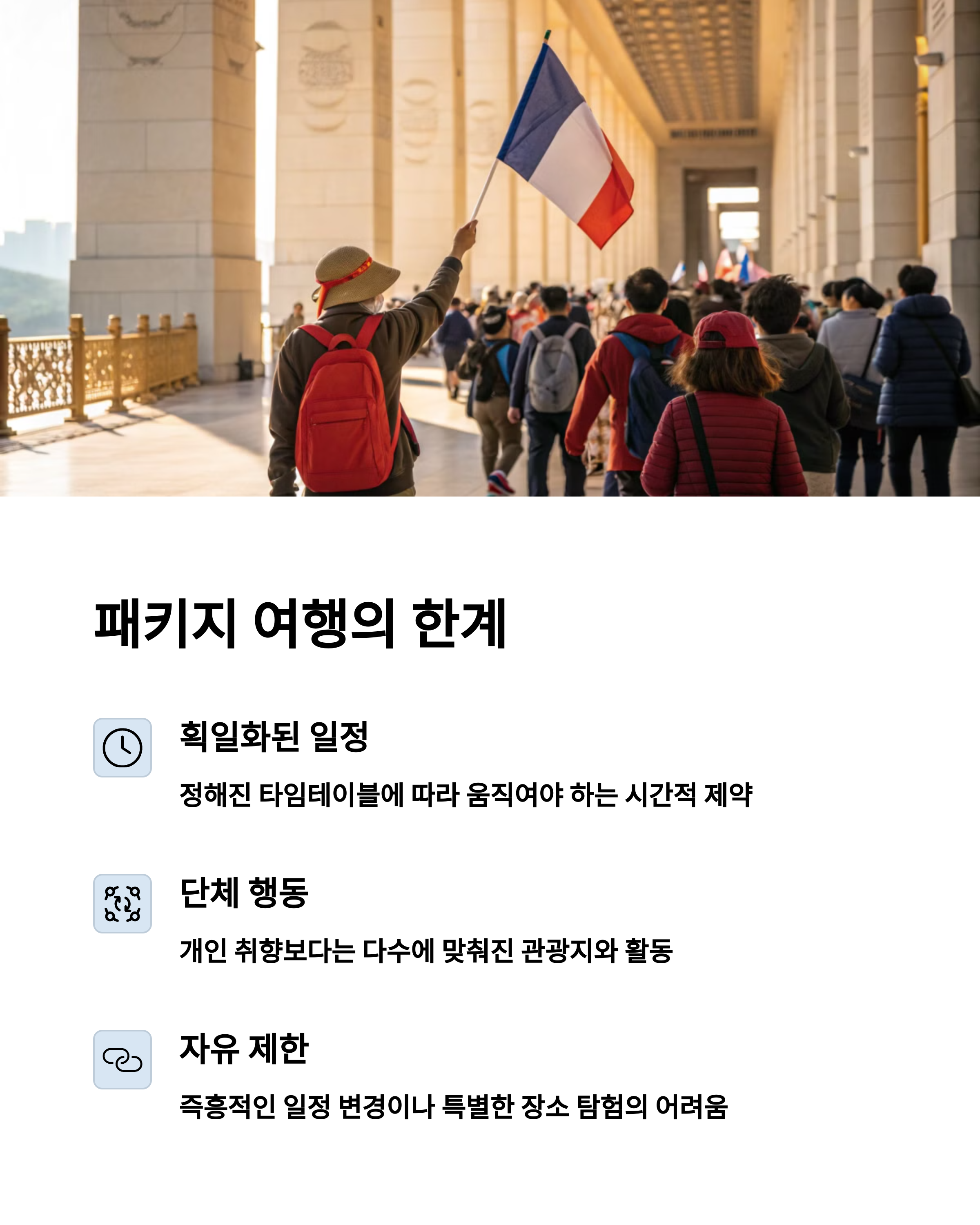 - 패키지 여행 단점: 자유 부족, 일정 강행군, 추가 옵션 강요 가능성