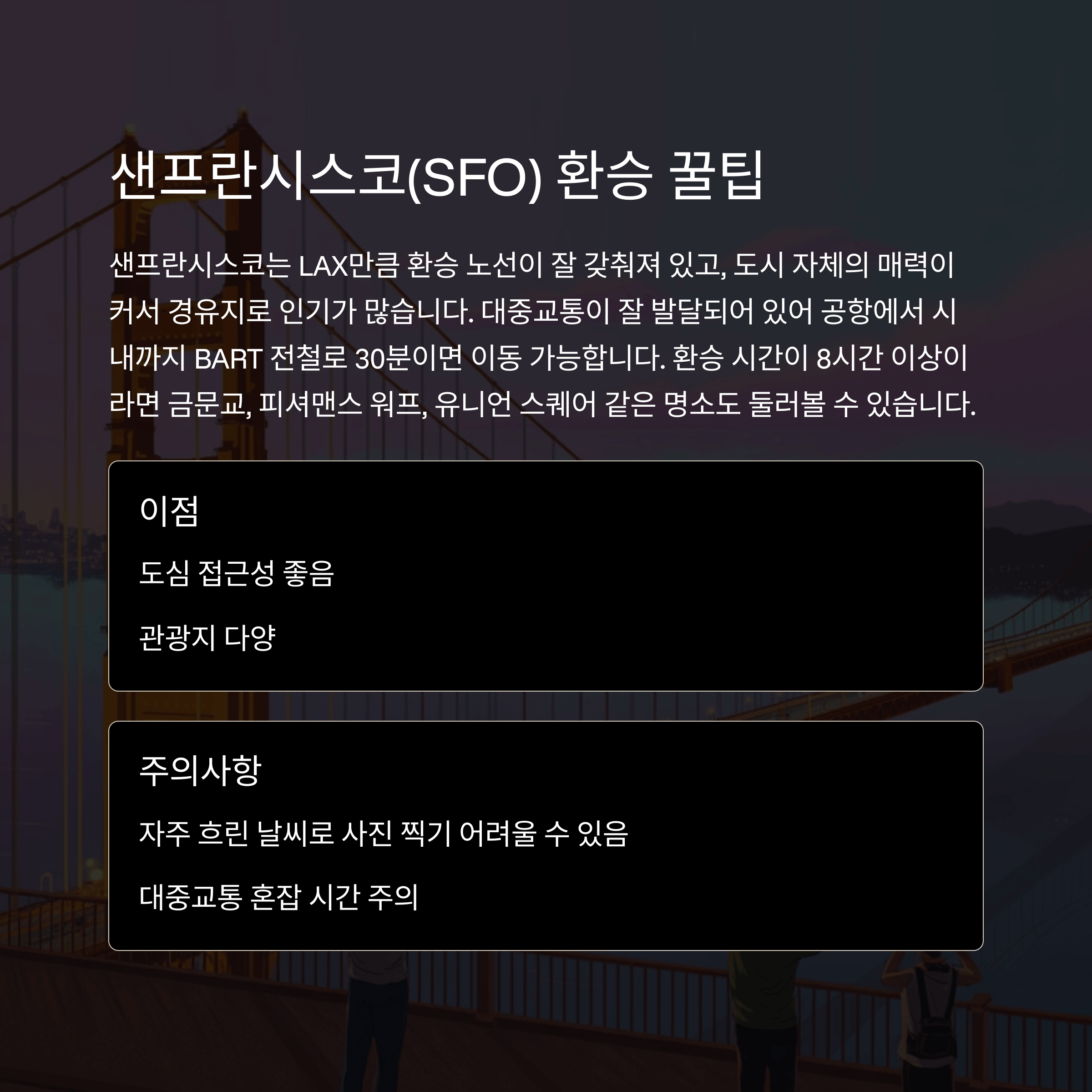 샌프란시스코는 LAX만큼이나 환승 노선이 잘 되어 있고, 도시 자체의 매력이 커서 경유지로 인기 많은 곳이에요. 특히 대중교통이 잘 발달되어 있어서 공항에서 시내까지 BART 전철로 30분이면 이동 가능하죠. 환승 시간이 8시간 이상이라면 금문교, 피셔맨스 워프, 유니언 스퀘어 같은 명소도 둘러볼 수 있어요.