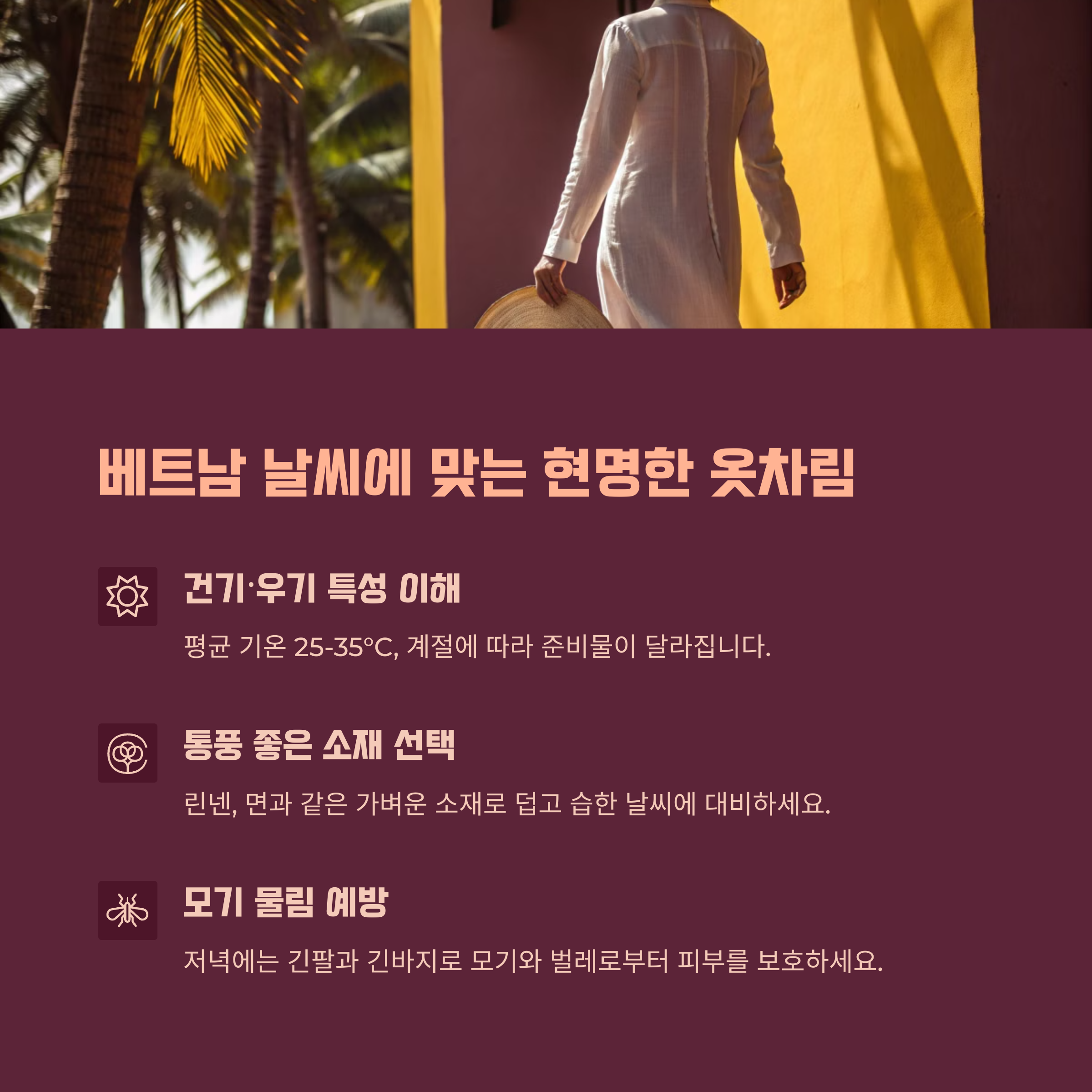 베트남은 고온다습한 기후 덕분에 땀이 많고 햇빛이 강한 나라입니다. 그만큼 현지 여행을 준비할 때는 선크림, 땀 흡수용 속옷, 얇고 통풍 잘 되는 옷을 꼭 챙기셔야 해요. 특히 호찌민, 다낭과 같은 지역은 낮 기온이 35도까지 오르는 경우도 많아, 기초적인 옷차림만으로도 여행의 쾌적함을 크게 좌우합니다. 또한 우기 시즌에는 갑작스러운 소나기가 자주 내리기 때문에 휴대용 우산이나 방수 슬리퍼도 유용하게 쓰인답니다.