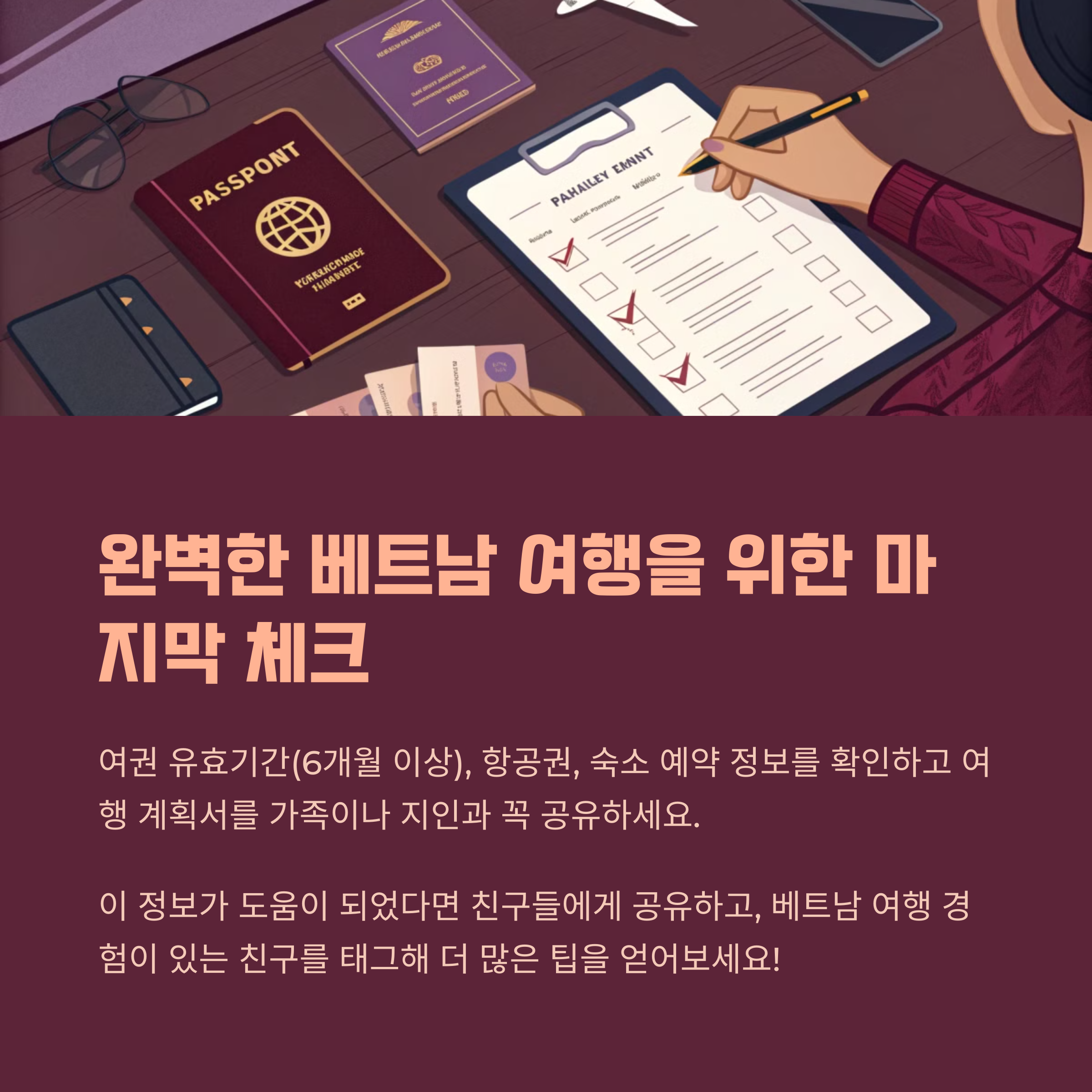여러분은 베트남 여행 시 어떤 아이템이 가장 유용했나요? 혹은 추천하고 싶은 꿀템이 있다면 댓글로 자유롭게 공유해 주세요! 실제 경험담은 다른 분들에게 큰 도움이 됩니다.