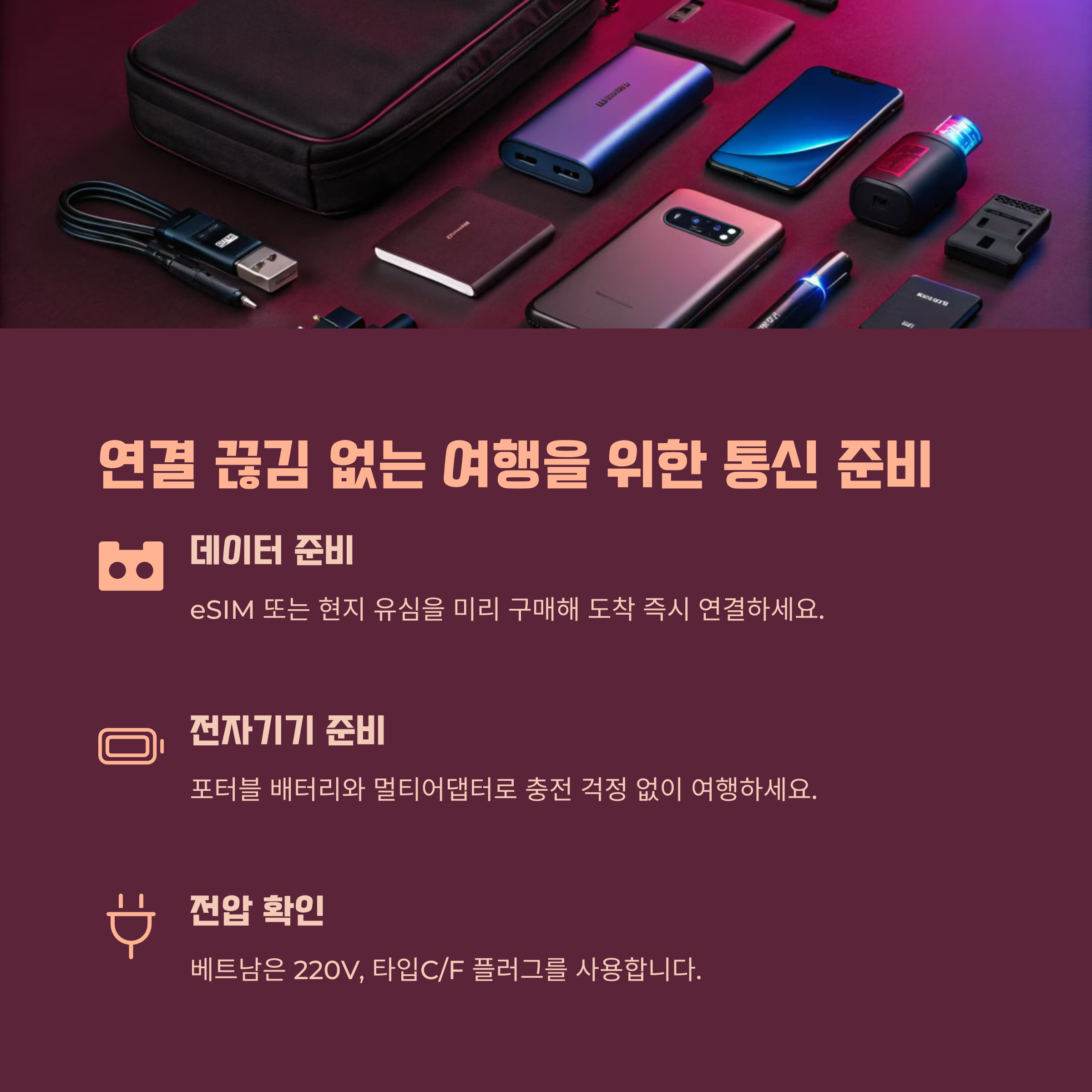 현지에서 추천하는 아이템 중 하나는 베트남 유심칩입니다. 공항보다는 현지 편의점이나 인터넷 사전 주문을 통해 구입하면 가격도 저렴하고 속도도 더 빠른 편이에요. 또한 모기 퇴치제나 멀티 어댑터도 꼭 챙겨야 할 필수템입니다. 베트남은 모기가 많은 편이라 모기 기피제나 전기 모기향이 굉장히 유용하며, 콘센트 규격이 다르기 때문에 멀티 어댑터 없이는 전자기기 사용이 어렵습니다.