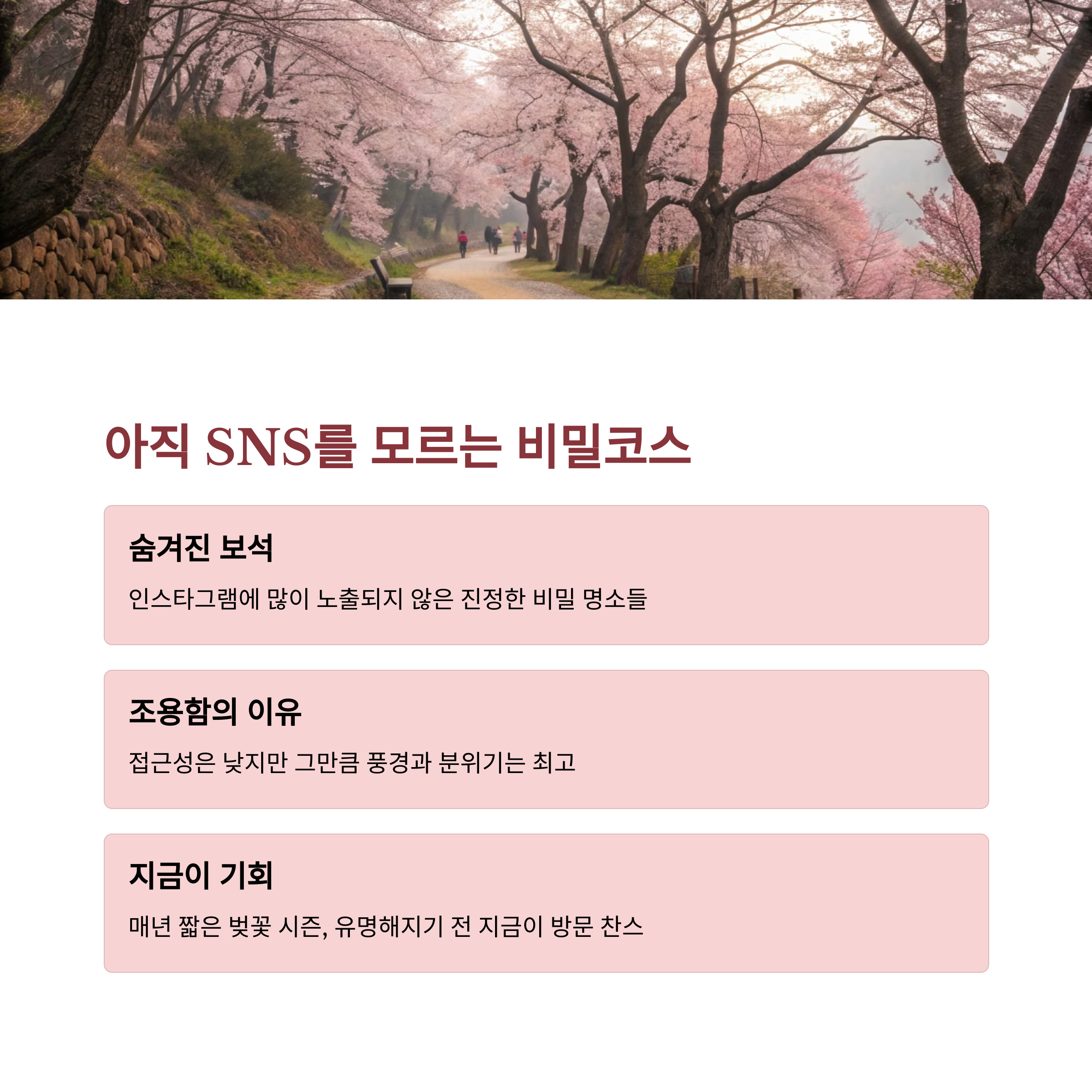 이번 벚꽃 시즌엔 덜 알려진 비밀스러운 장소들을 눈여겨보세요.