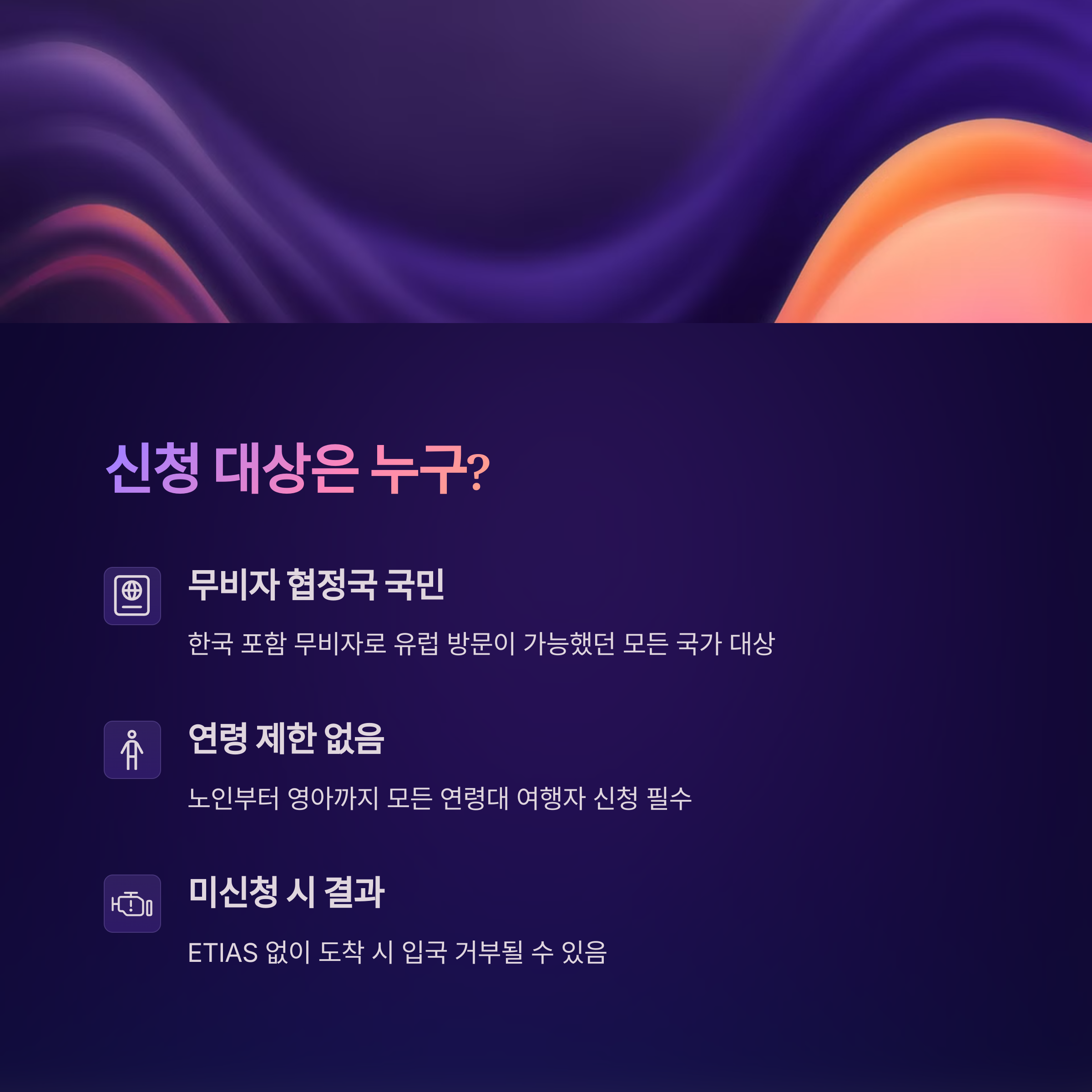 ETIAS는 90일 이하의 단기 체류 목적</strong일 경우에만 필요하며, 유학, 취업 등 장기 체류 목적은 해당 국가 비자를 별도로 발급받아야 합니다.