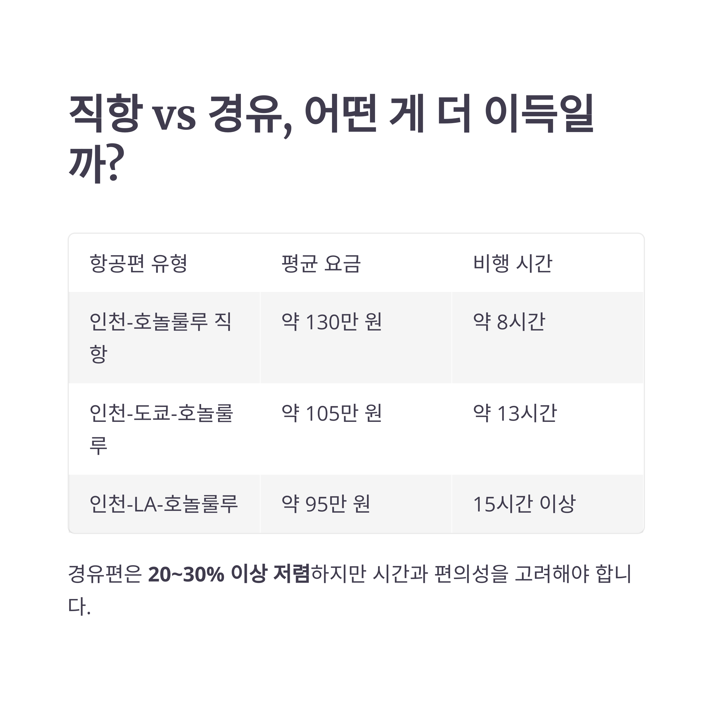 | 인천-호놀룰루 직항 | 약 130만 원 | 약 8시간 |