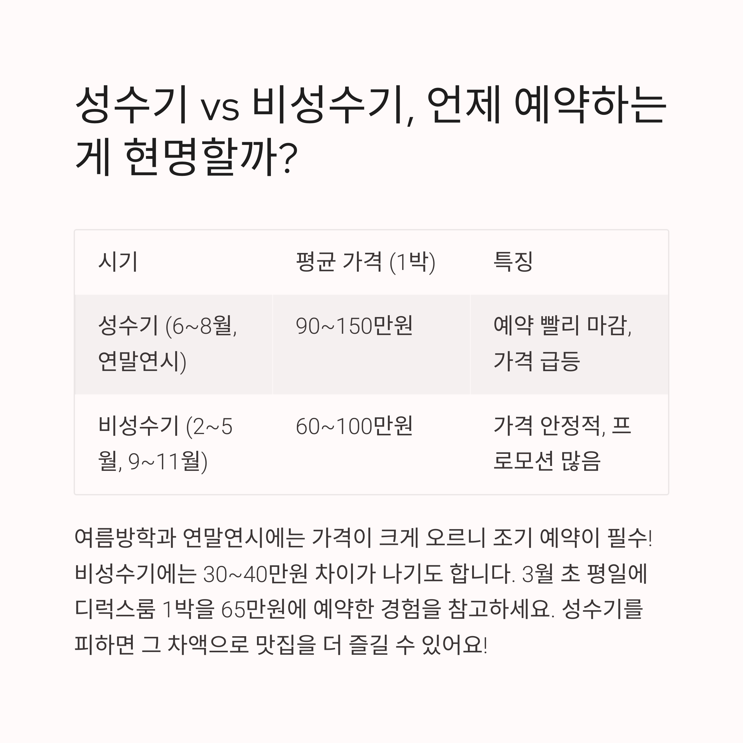 | 성수기 (6~8월, 연말연시) | 90~150만원 | 예약 빨리 마감, 가격 급등 |