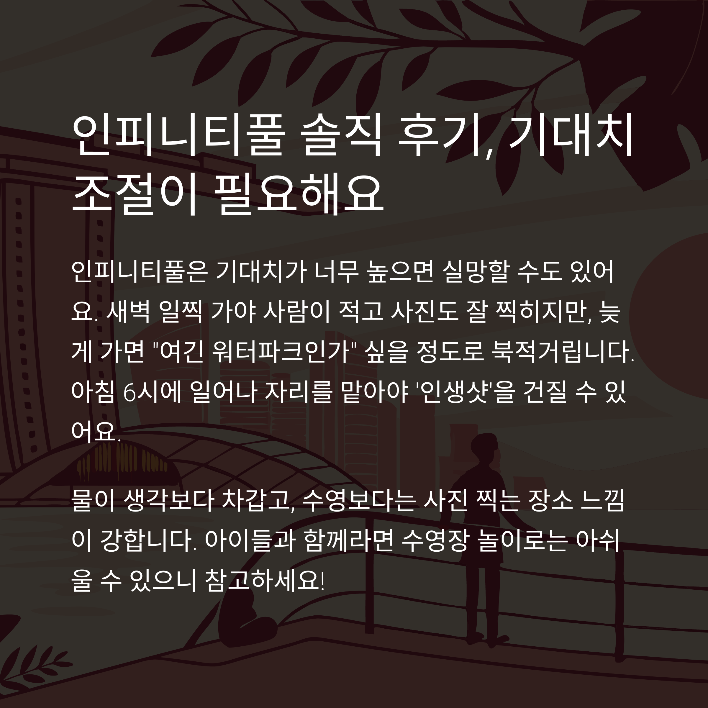 솔직히 말하면… 인피니티풀 기대치 너무 높으면 실망할 수도 있어요. 새벽 일찍 가야 사람 없고 사진도 잘 찍히는데, 늦게 가면 “여긴 워터파크인가” 싶을 정도로 북적북적! 저는 아침 6시에 일어나서 수영장 가서 자리 맡았어요. 그때 찍은 사진은 진짜 ‘인생샷’이더라구요. 다만 물이 생각보다 차갑고, 수영보다는 사진 찍는 곳 느낌이에요. 애들 데리고 가면 수영장 놀이로는 아쉬울 수 있다는 점 참고!