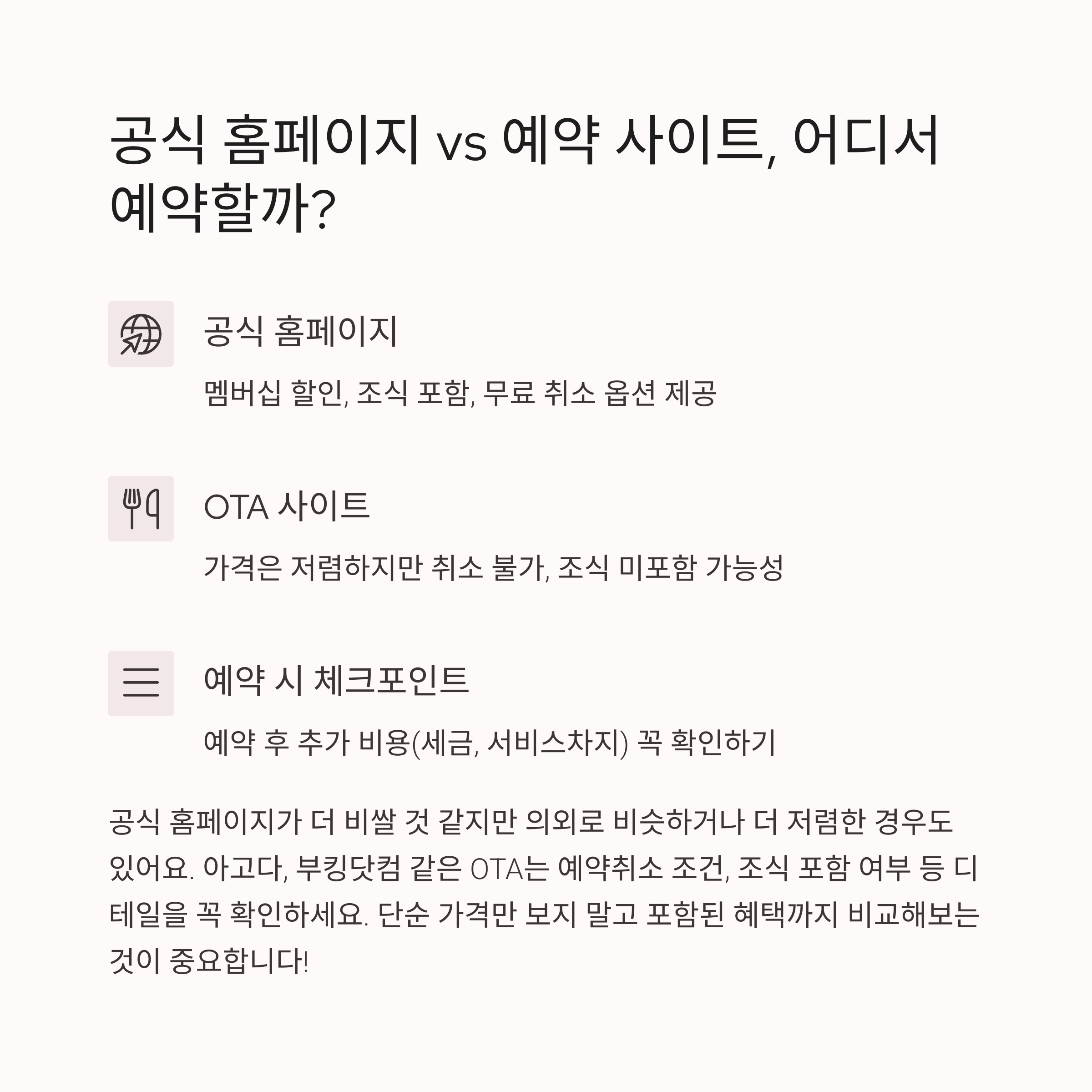 - OTA: 가격은 저렴하지만 취소 불가, 조식 미포함 가능성