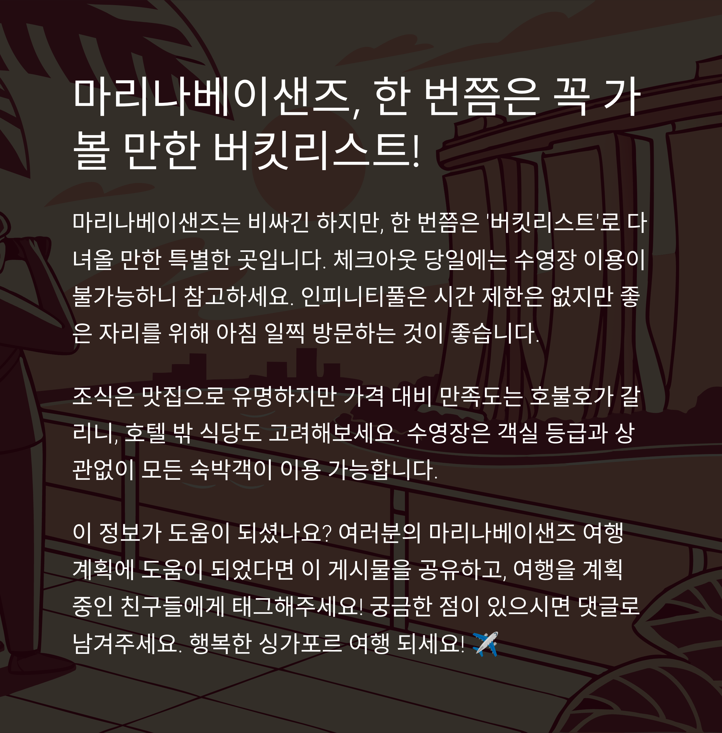여기까지 긴 글 읽어주셔서 정말 감사해요! 솔직히 마리나베이샌즈는 비싸긴 한데, 한 번쯤은 ‘버킷리스트’로 다녀올 만한 곳인 것 같습니다. 저처럼 시행착오 없이 더 즐겁고 알찬 여행 되시길 진심으로 바랍니다. 혹시 더 궁금한 점이나 후기 공유하고 싶으신 분들은 댓글로 남겨주세요! 저도 또 가고 싶어서 여러분 이야기 듣는 게 너무 좋습니다 :)