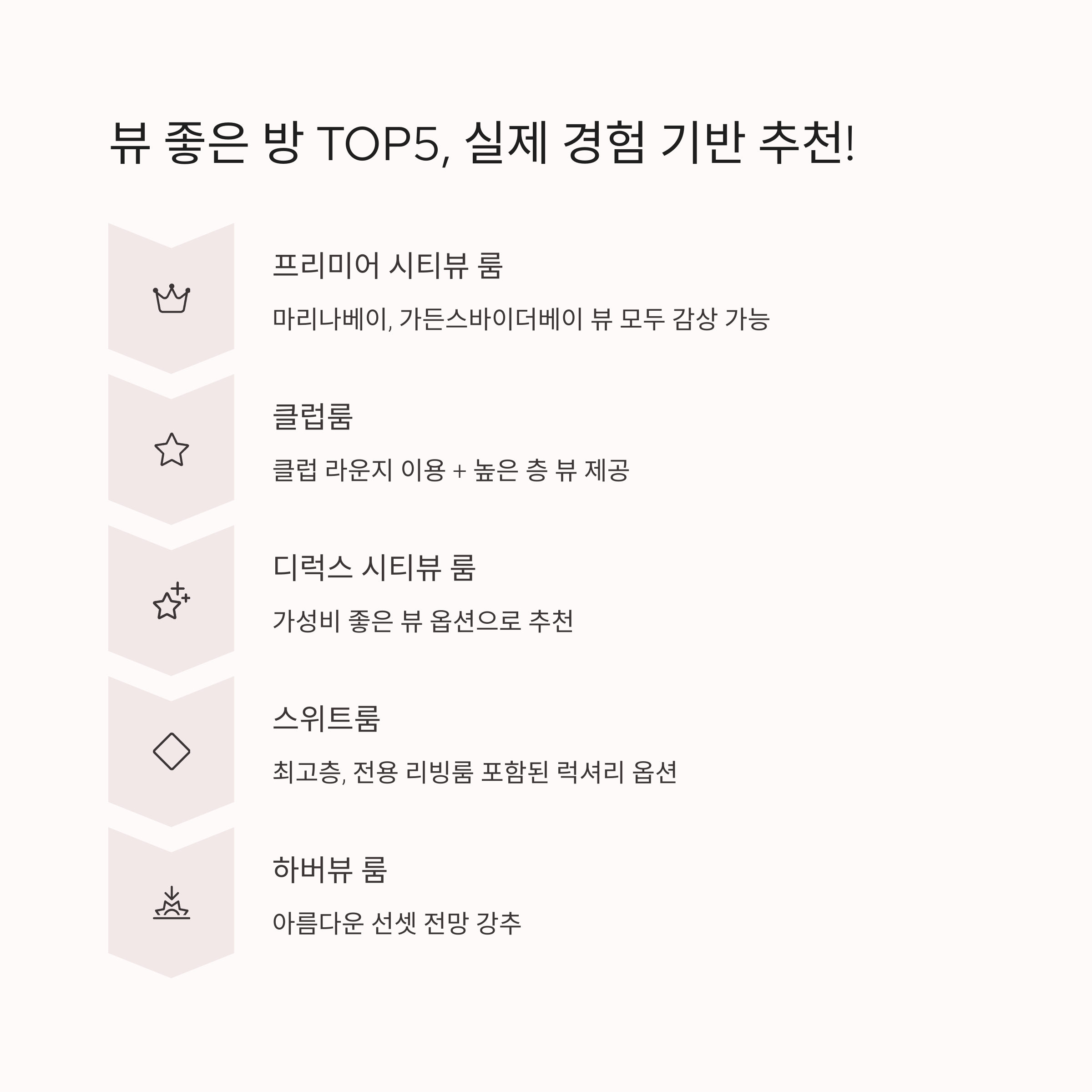 | 1 | 프리미어 시티뷰 룸 | 마리나베이, 가든스바이더베이 뷰 모두 가능 |