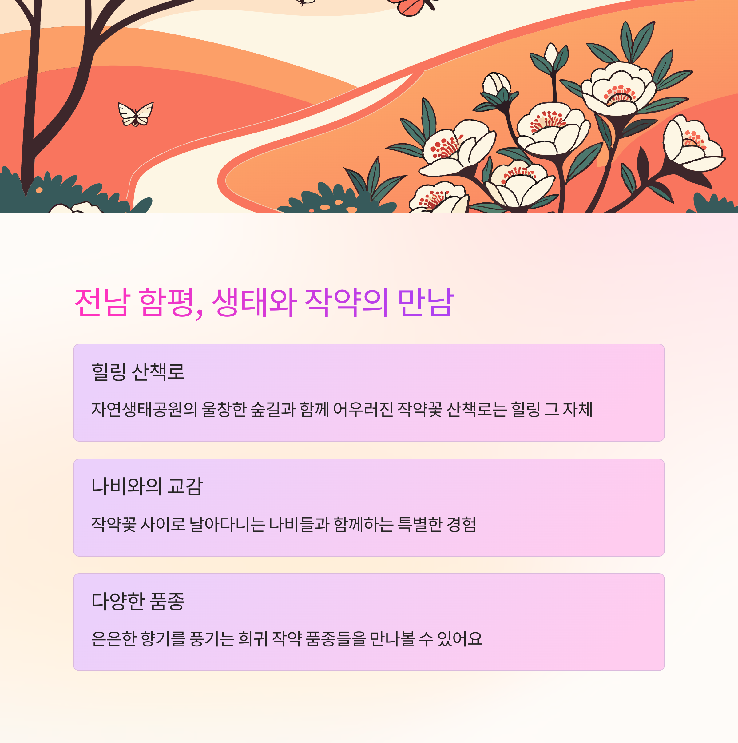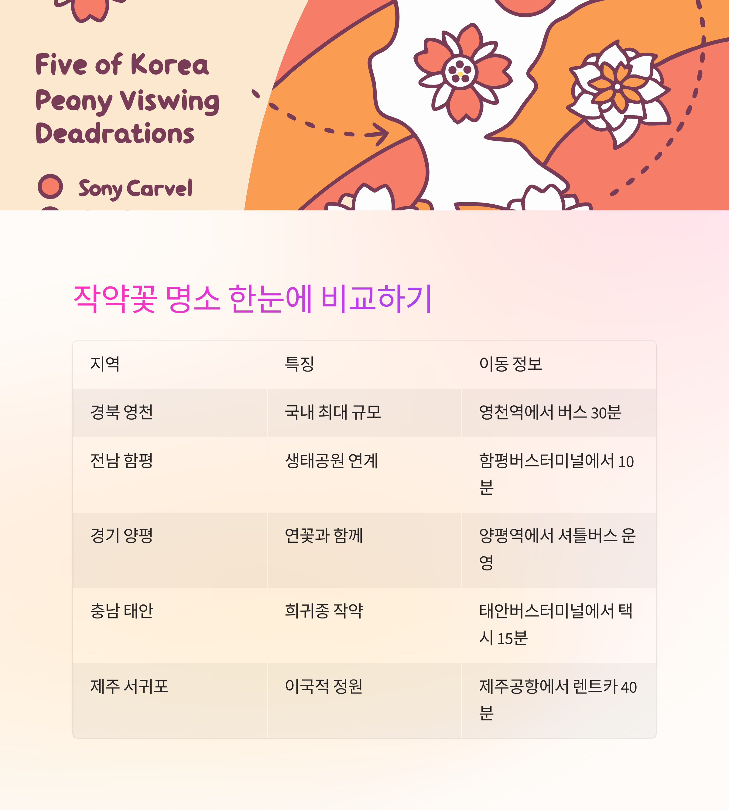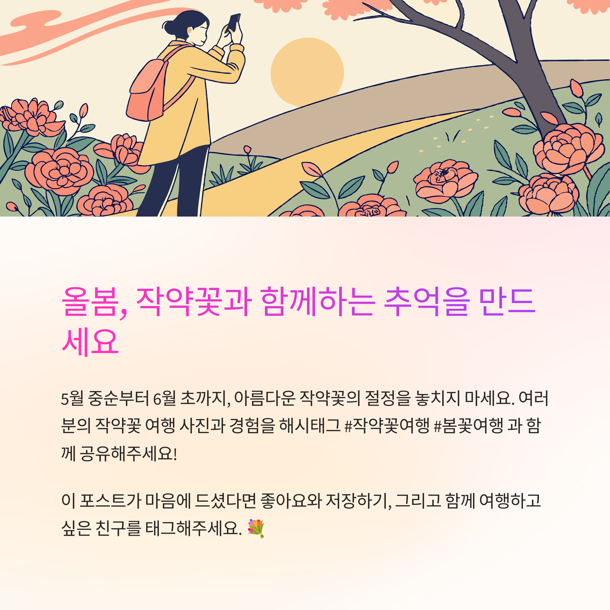 "아름다운 작약꽃을 감상하며 지역의 맛집을 함께 즐기는 여행은 더욱 특별한 추억이 됩니다."