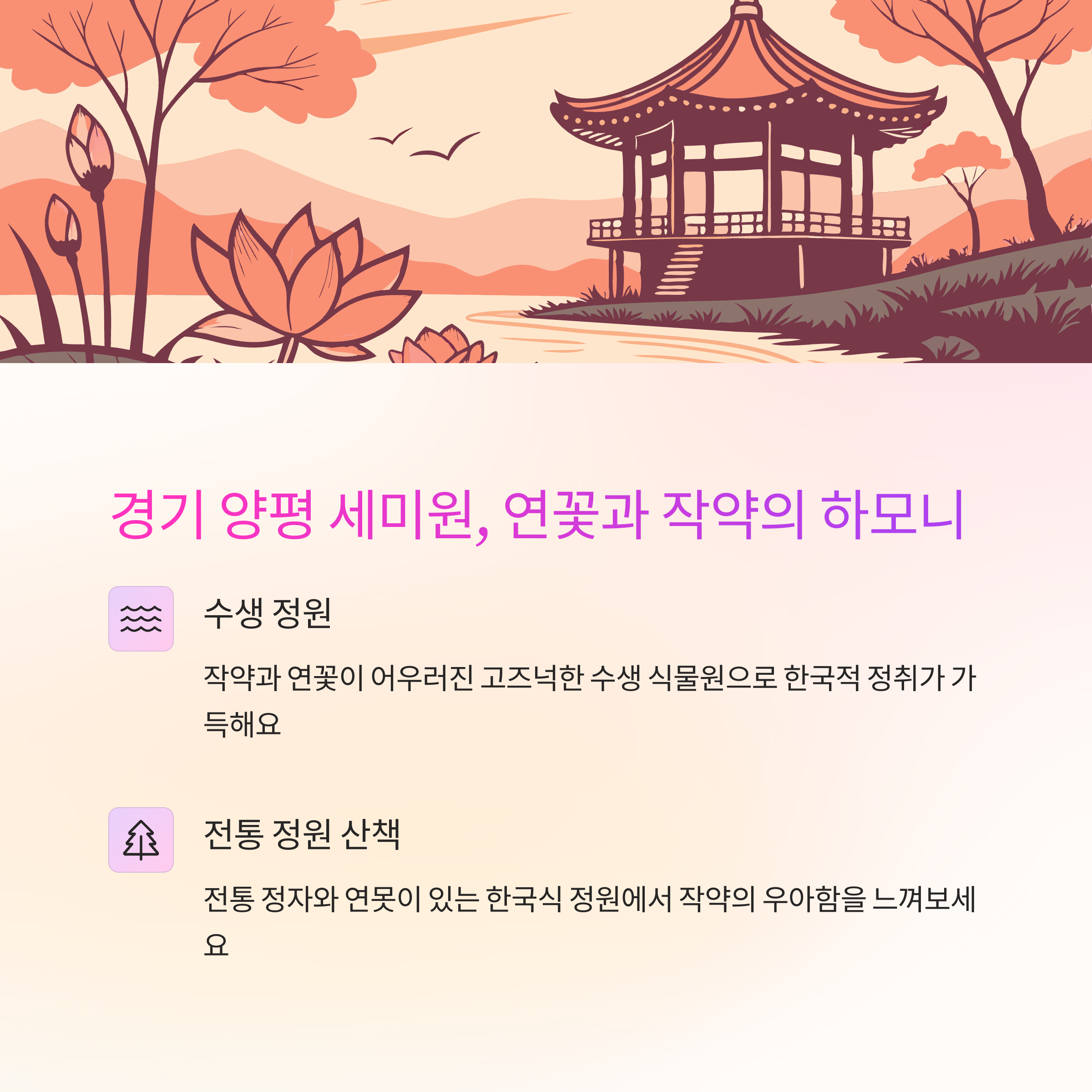 | 경기 양평 | 세미원 | 연꽃과 함께 감상 가능 |